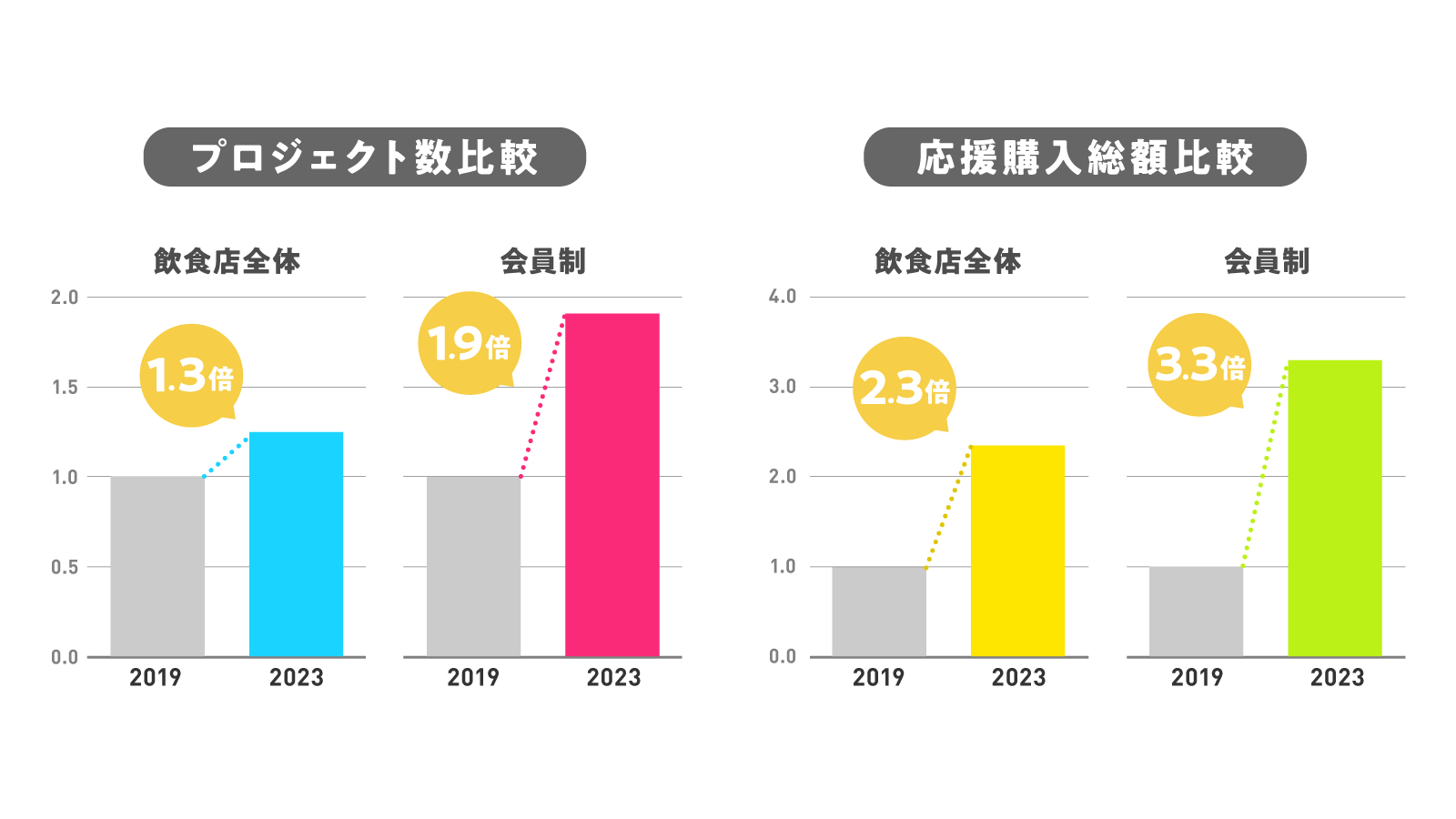2023年において、「レストラン・バー」カテゴリーのプロジェクト全体では、プロジェクト数は2019年比1.3倍、応援購入総額は同2.3倍に成長しました。一方、「レストラン・バー」カテゴリーの中でもタグ「#会員制」を含むプロジェクトに関しては、プロジェクト数が同1.9倍、応援購入総額が同3.3倍へと、より大きな成長を見せています。(※3)