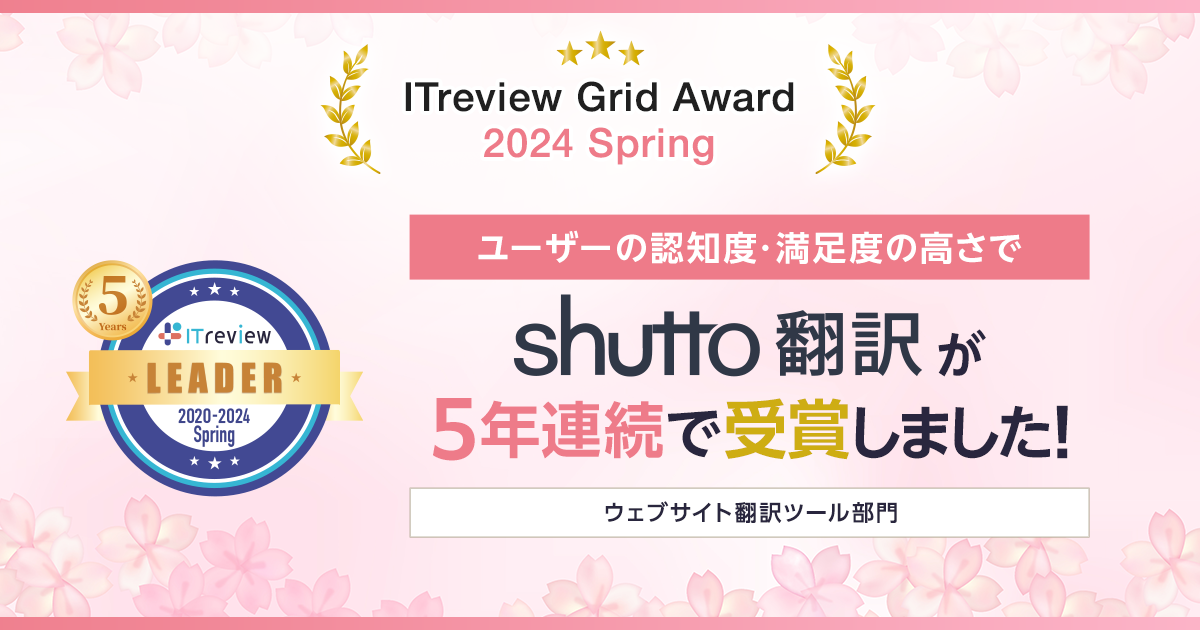 「ITreview Grid Award 2024 Spring」でWebサイト翻訳サービス「shutto翻訳」が5年連続受賞!