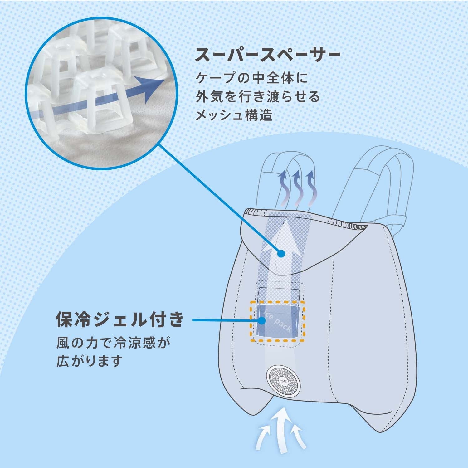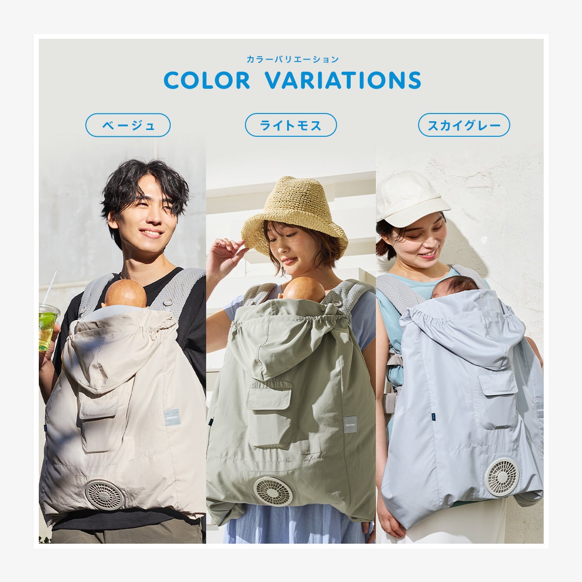 ファンによる「気化熱冷却」に加え、赤ちゃんの背中にあたる「保冷ジェル」が、こもりやすい熱をやさしく逃がします。ファンがケープ内部の熱気と湿気を循環させることで、抱っこによる親の背中・お腹側の「蒸れ」も軽減し、親子の両方が「快適で涼しい」状態を長く保てるのが特長です。今年もその「理想的なハイブリッド冷却」を継承しています。