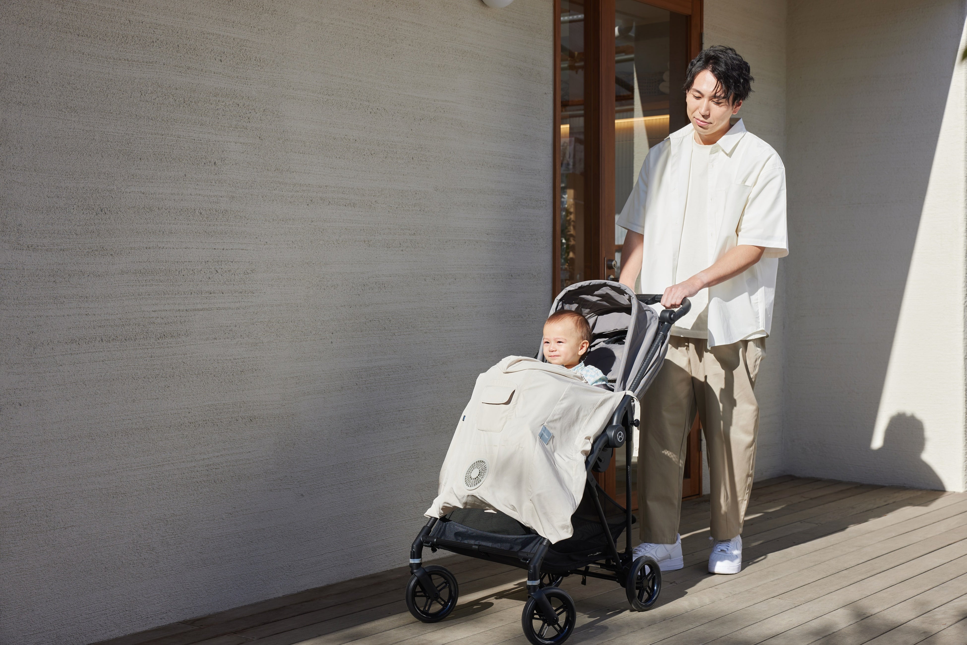 抱っこひも用ケープとして最適化された円形状の開口部を配置。内部に効率よく外気を取り入れるためのファンを、安全かつスマートに装着できる独自のデザインを実現しました。