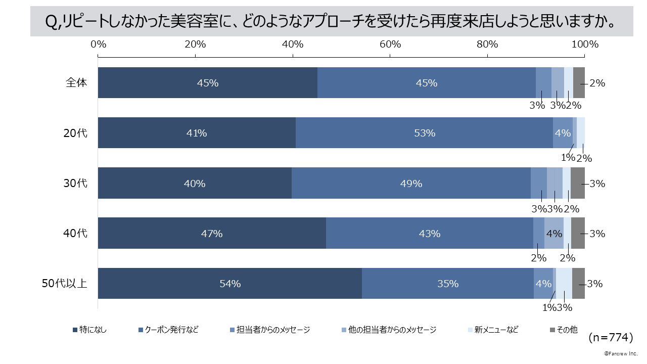 過去にリピートしなかった店舗から、その後「再来店を促すような施策を「受けなかった」と回答した人は、美容室で69%、整骨院では77%でした。ただし、リピートしなかった店舗から「クーポン発行など」のアプローチがあれば再来店しようと思うと回答したのは45%を占めました。