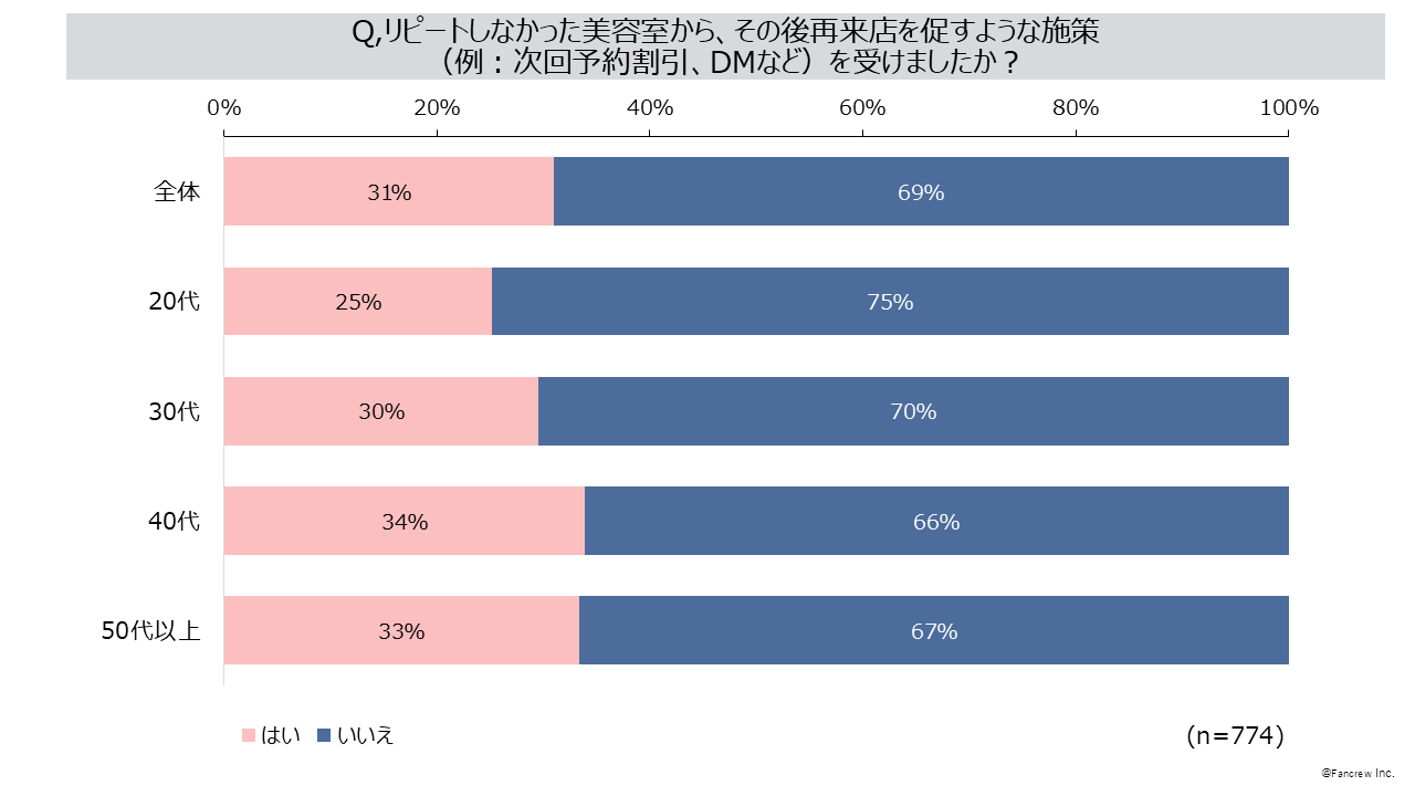 1.美容室で69%、整骨院では77%の離脱客が、店舗から「再来店を促す施策を受けていない」と回答