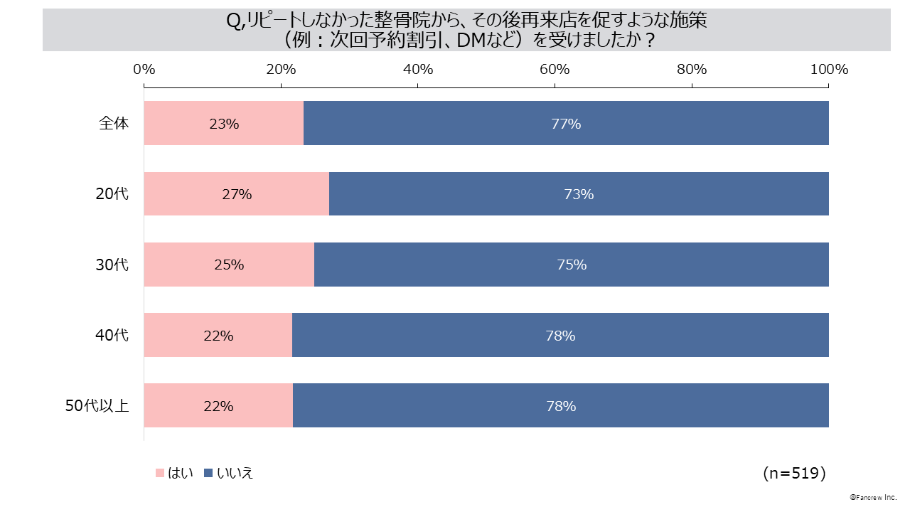 1. 美容室で69%、整骨院では77%の離脱客が、店舗から「再来店を促す施策を受けていない」と回答