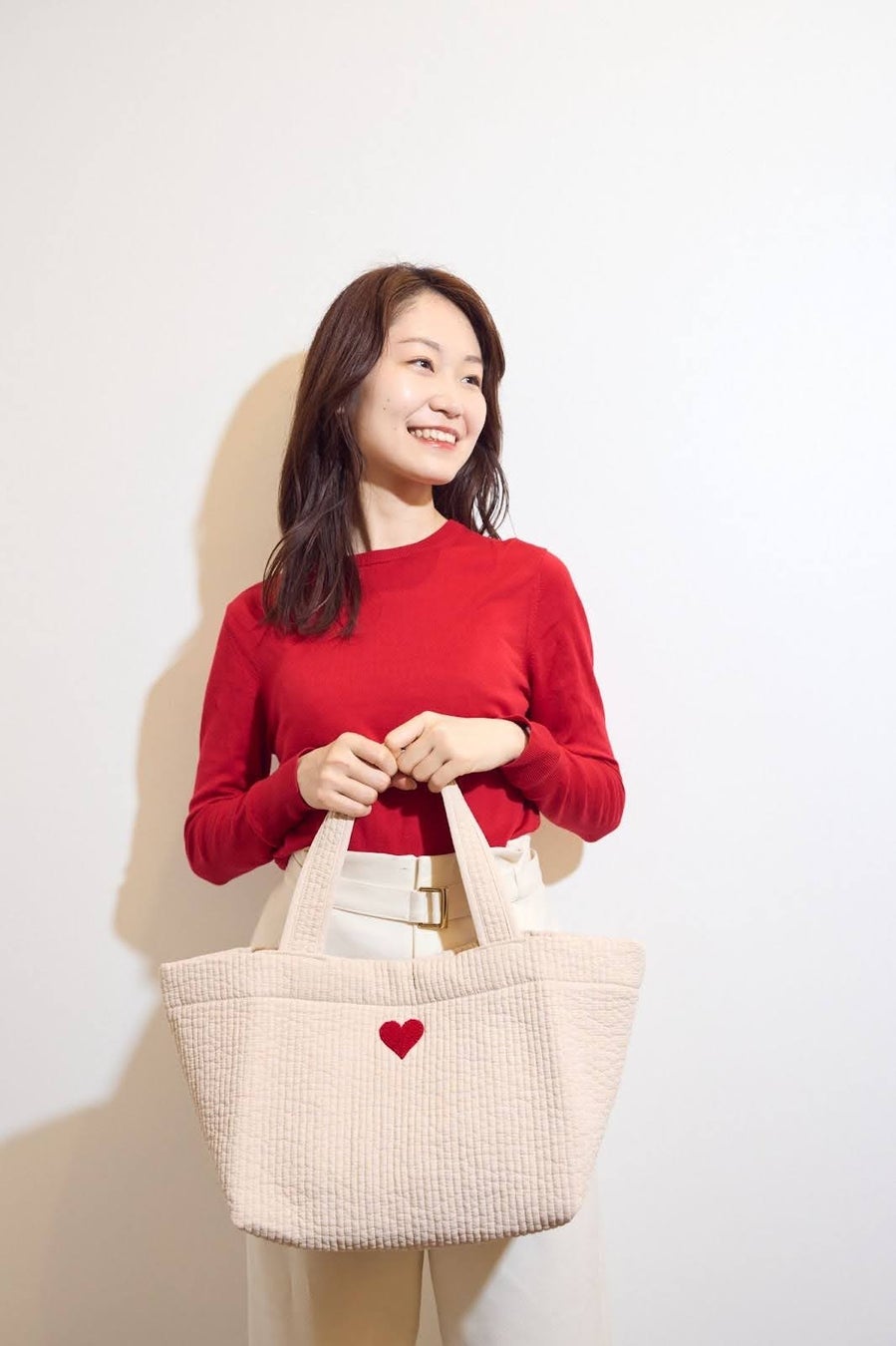 立体的なハートモチーフの刺繍がかわいいヌビバッグです。