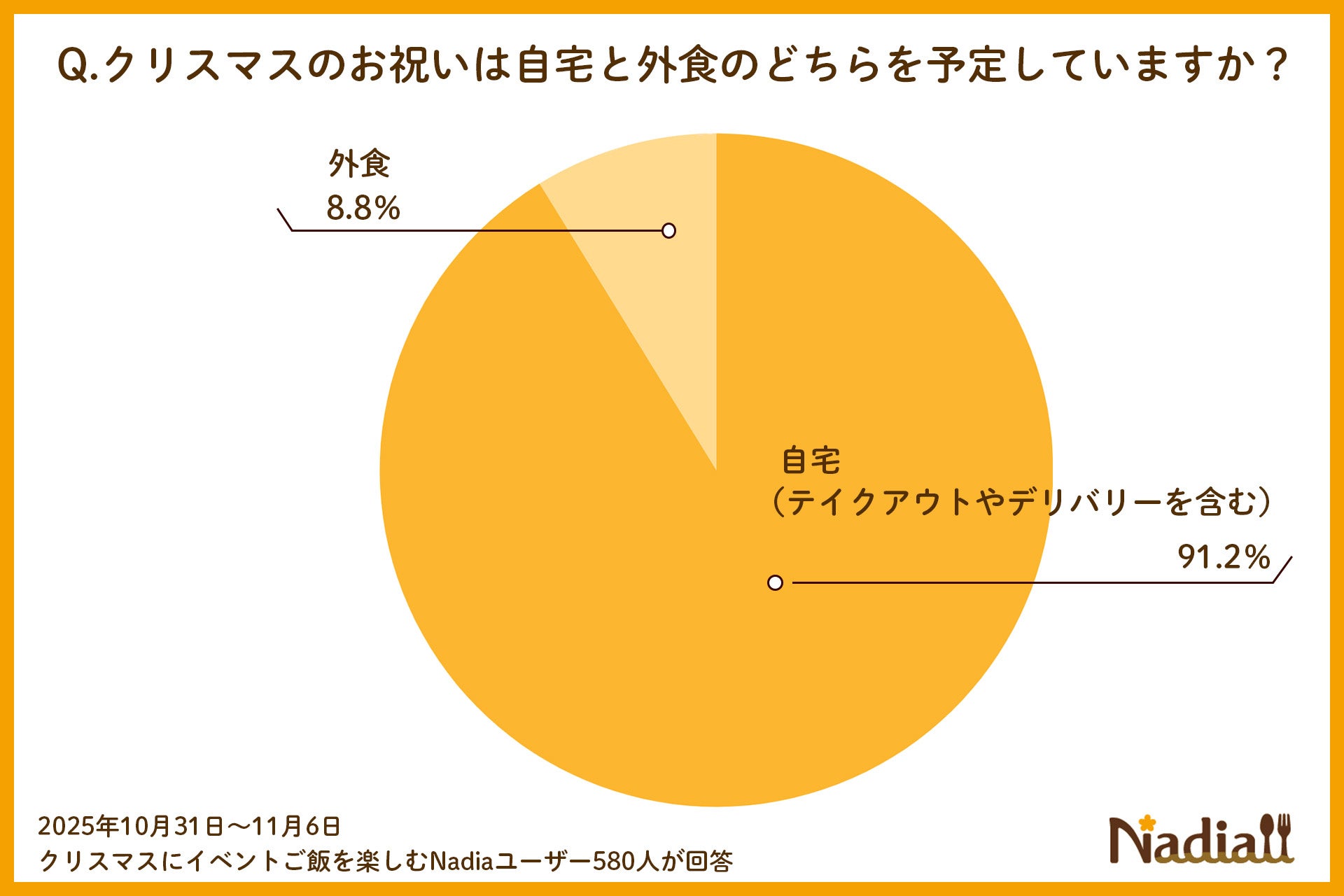 さらに食事については、「自宅(テイクアウトやデリバリーを含む)」が91.2%と圧倒的で、「外食」(8.8%)を大きく引き離し、「おうちクリスマス」が定番であることが分かりました。