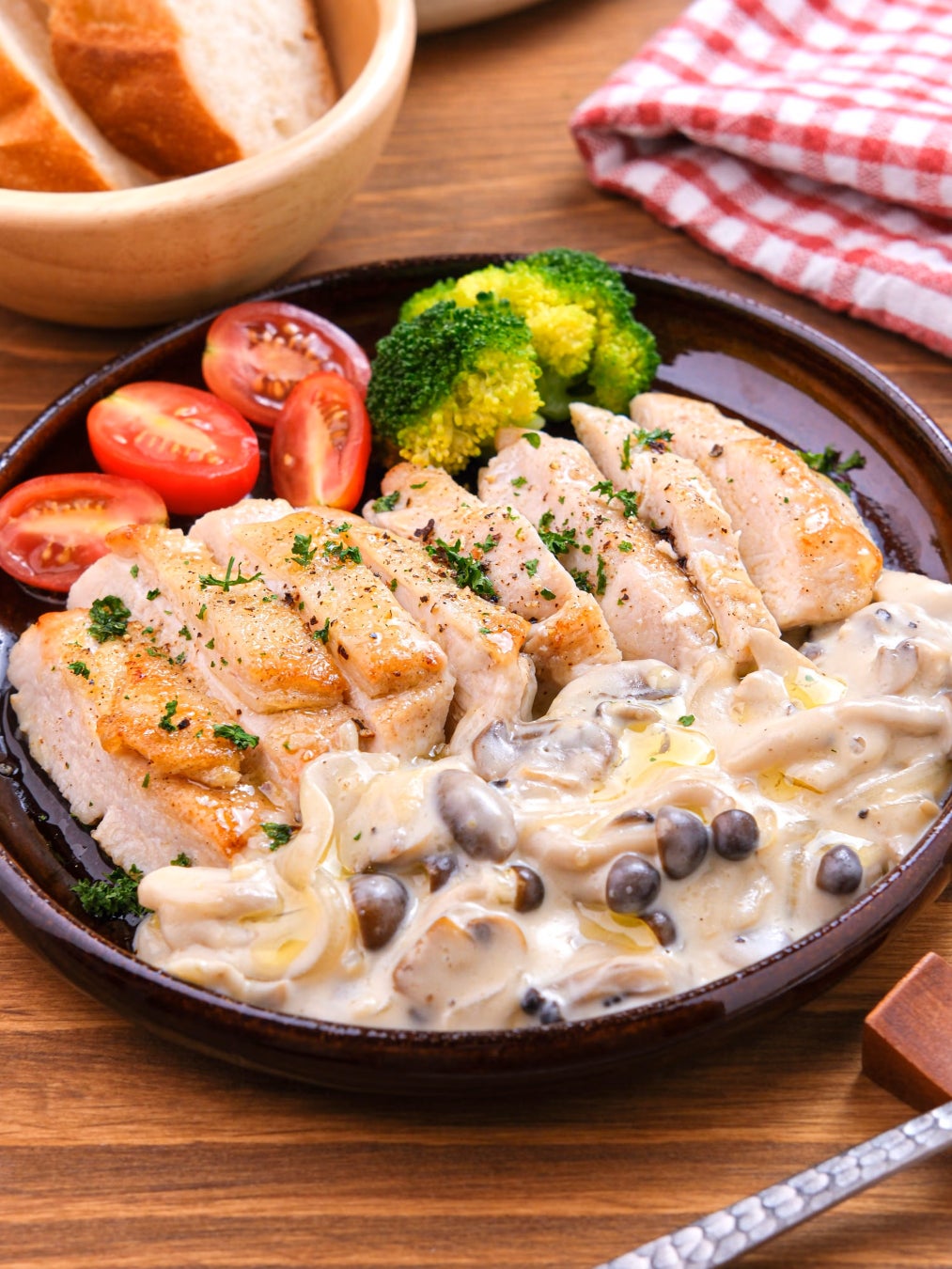 【きのこソースのチキンステーキ】鶏むね肉がしっとり柔らか!