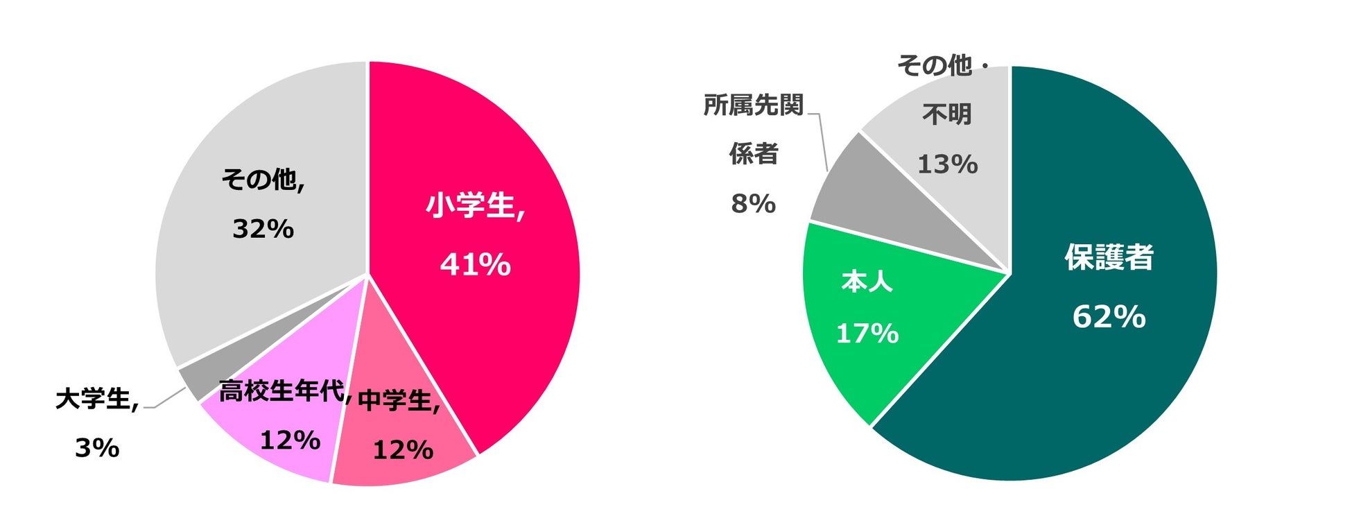 被害者の6割以上が未成年であり、そのうち4割は小学生が被害者となっています。指導者やコーチから不適切行為を行われても声をあげづらい立場にいる子どもたちが被害者になるケースが多いことが分かります。また、相談者(通報者)についても、被害者の多くが未成年であることから、被害者の保護者から相談を受けるケースが多いことが分かります。