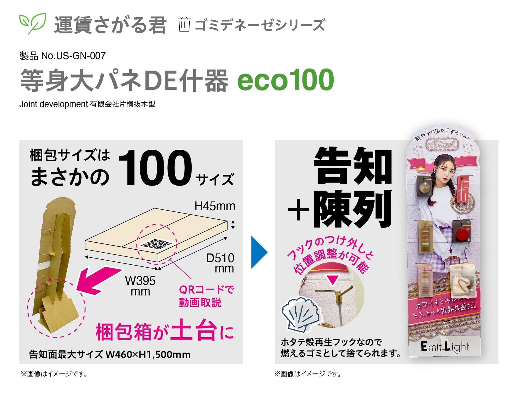 今回、新たに加わった「運賃さがる君/ゴミデネーゼシリーズ」のラインアップ製品「等身大パネDE什器eco100」は、IPビジュアルによる広告訴求と、商品を吊下げて陳列できる販売機能を一体化した環境配慮型の店頭販促什器。等身大パネルの高い視認性により、売場での立ち止まり率を向上させつつ、商品を手に取りやすい導線をつくることで、購買促進に繋がる売場演出を実現します。