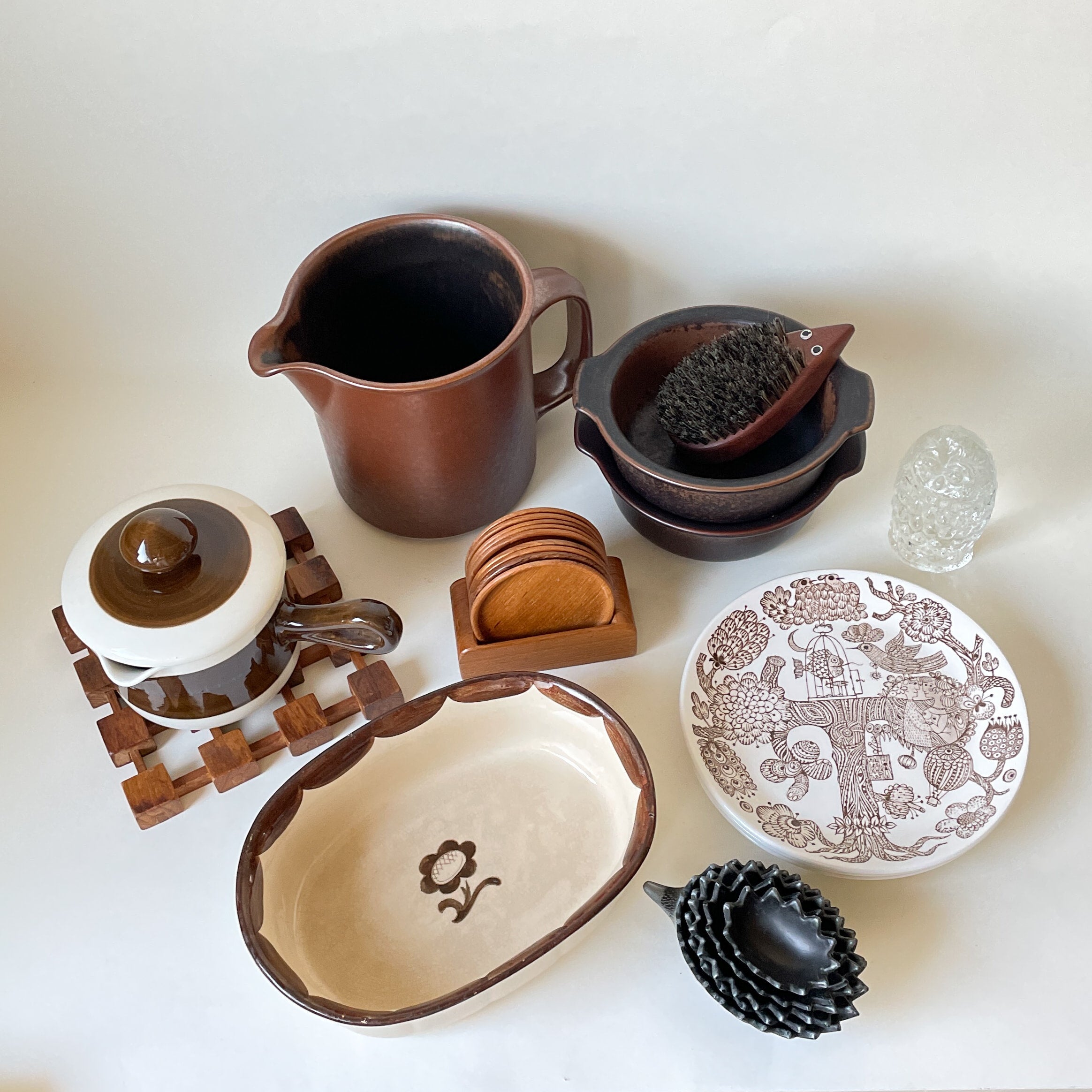 フィンランドの「アラビア」やスウェーデンの「グスタフスベリ」など、日本でも人気の、北欧の食器ブランド。そのヴィンテージ品として、この季節にぴったりなブラウン系のアイテムが並びます。*ヴィンテージ食器は、現地では日常的に使われているものですが、日本での販売においては「インテリア雑貨」の扱いとなります。ご了承ください。
