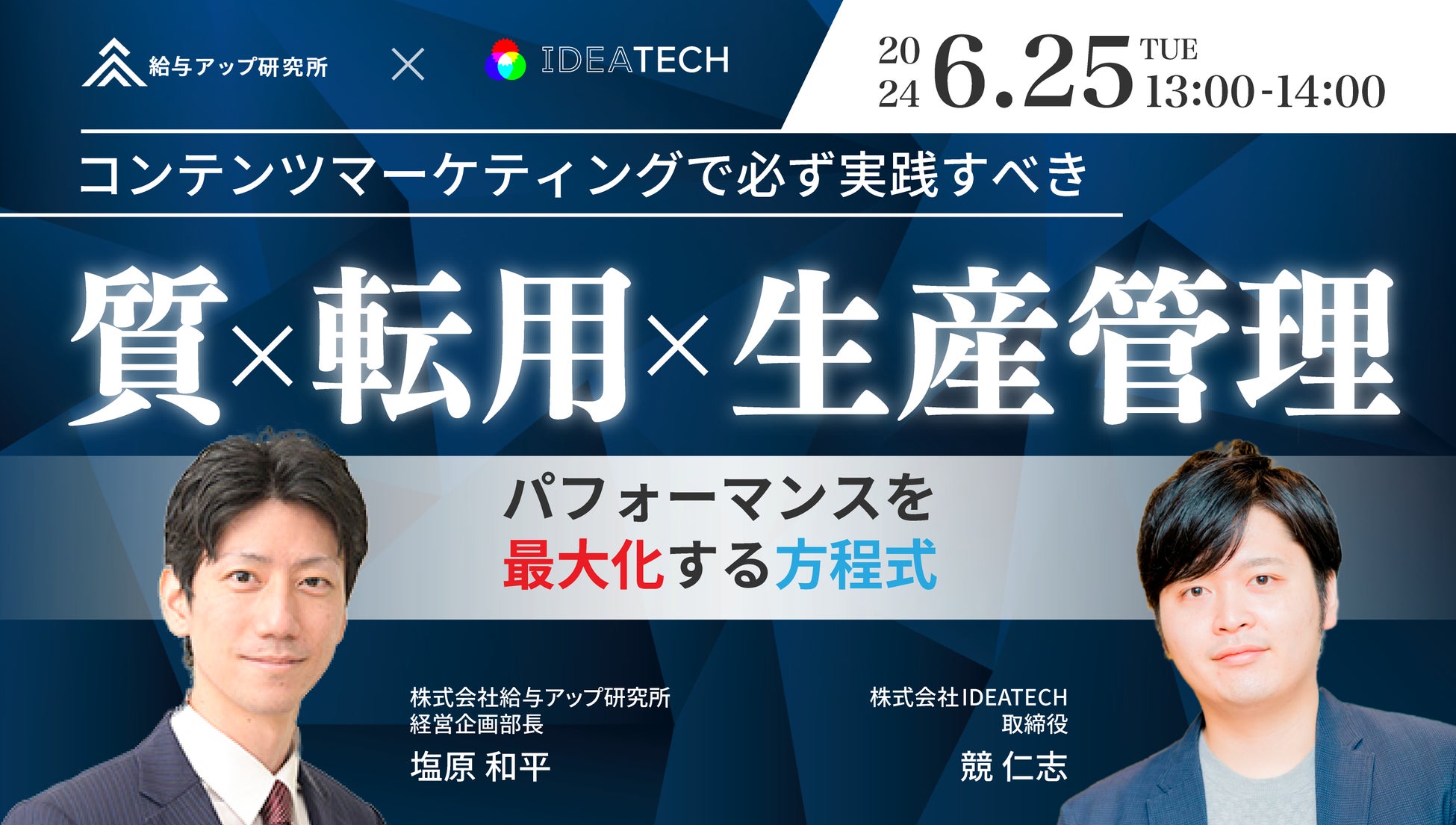 ファクトに基づいたコンテンツ開発とマーケティング支援を行う、株式会社IDEATECH(本社:東京都港区、代表取締役社長:石川友夫、以下 IDEATECH)は、株式会社給与アップ研究所(本社:東京都千代田区、代表取締役:高橋 恭介)と共同で、2024年6月25日(火)13:00-14:00に「コンテンツマーケティングで必ず実践すべき「質」×「転用」×「生産管理」〜パフォーマンスを最大化する方程式〜」と題するオンラインセミナーを開催いたしますので、お知らせいたします。