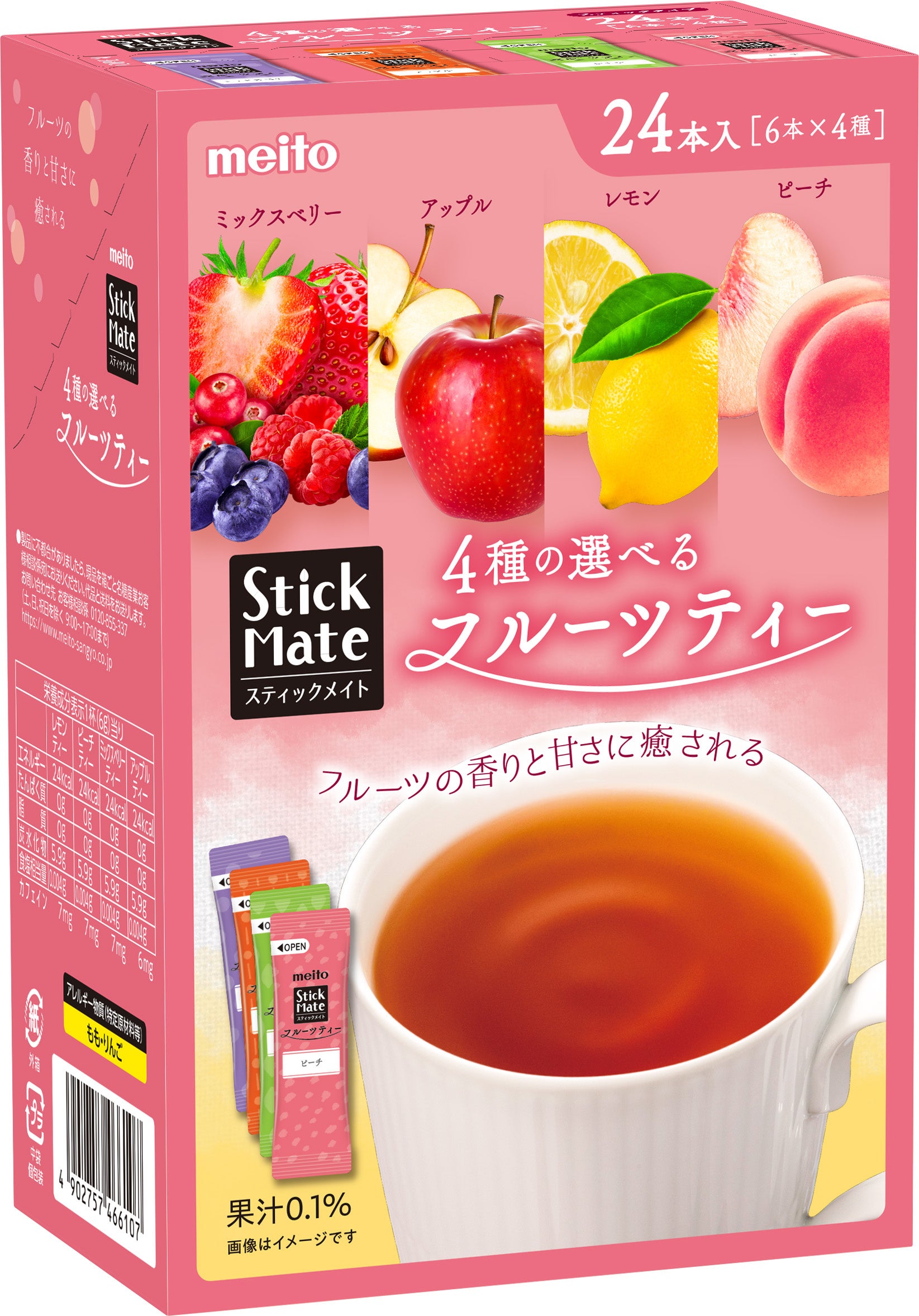 「スティックメイト 4種の選べるフルーツティー」はレモンティー、ピーチティー、ミックスベリーティー、アップルティーの4種類のフレーバーをお好みや気分に合わせてお楽しみいただけます。簡単にお水に溶け、アイスでもホットでもおいしく召し上がれます。また、手軽に衛生的に持ち運べるスティックタイプなので、オフィスやご家庭でのストックはもちろん、マイボトルに入れて持ち歩きもおすすめです。