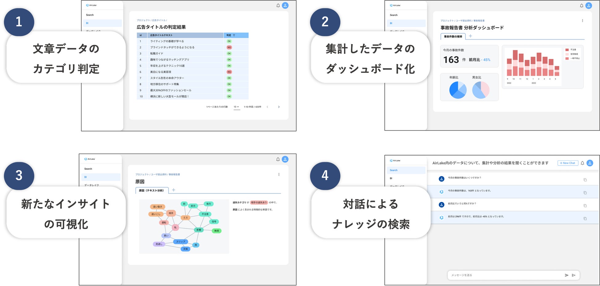 「AirLake」はあらゆる形式のデータを自動で構造化し、構造化したデータから新たなインサイトや価値を生み出します。問い合わせやアンケートの分析などに役立つ文章データのカテゴリ判定や、集計したデータのダッシュボード化、学習したデータを生成AIとのチャット形式で検索できるなど、膨大な情報を有効活用するための仕組みを備えています。