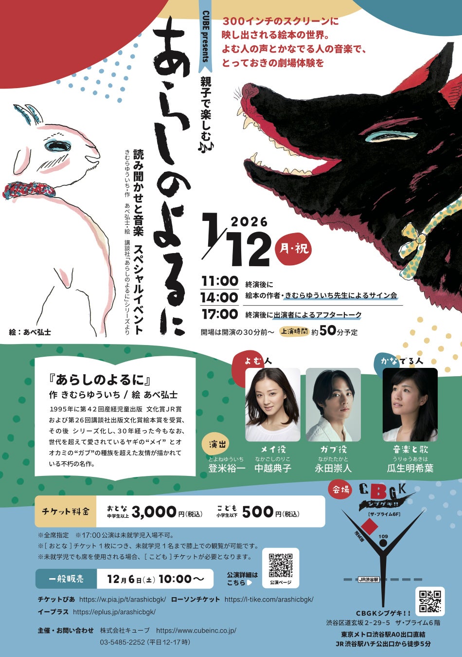 2026年1月12日(月・祝)、東京・渋谷のCBGKシブゲキ!!にて、絵本『あらしのよるに』の読み聞かせと音楽を組み合わせた、親子で楽しめるスペシャルイベントがいよいよ来週開催!