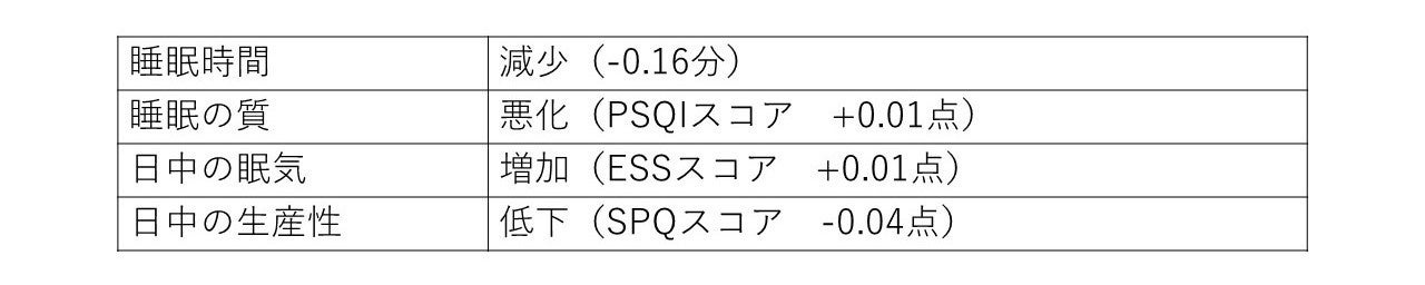 往復の通勤時間が1分増えるごとに下記の影響が統計的に有意にみられました※4。