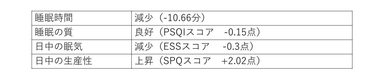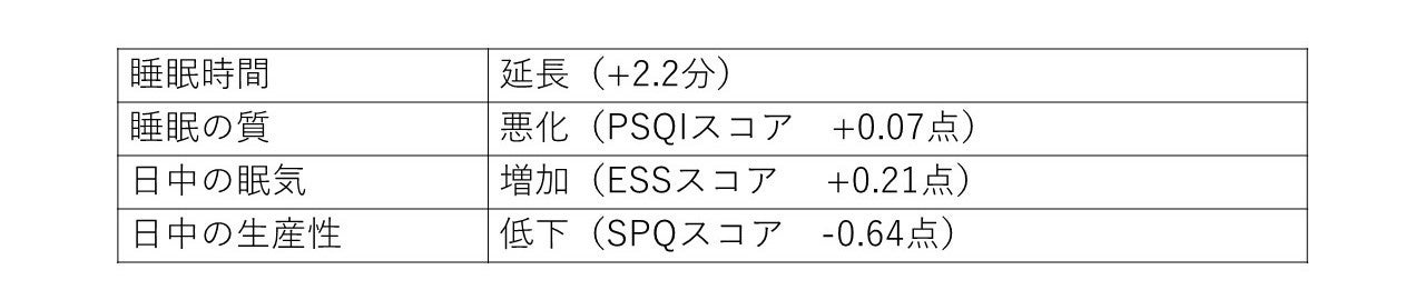 在宅勤務回数が多いと睡眠時間は長いものの、睡眠の質は悪く、日中の眠気が高くて生産性が低いことがわかりました。これはオフィス勤務と比較して通勤がないため睡眠時間が確保できているが、時間のメリハリがつきにくく、結果として睡眠の質が悪化してしまい、働き方としてはパフォーマンスが低いことを示唆しています。コロナ禍で調査した睡眠偏差値®調査2021※9の結果でも、週に1~2回の在宅勤務などの変則的な働き方では睡眠の質が低いことが報告されています。今回の研究結果でも、週の中で異なる働き方をすると睡眠の質が悪化する可能性が示唆されました。
