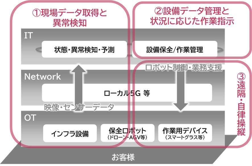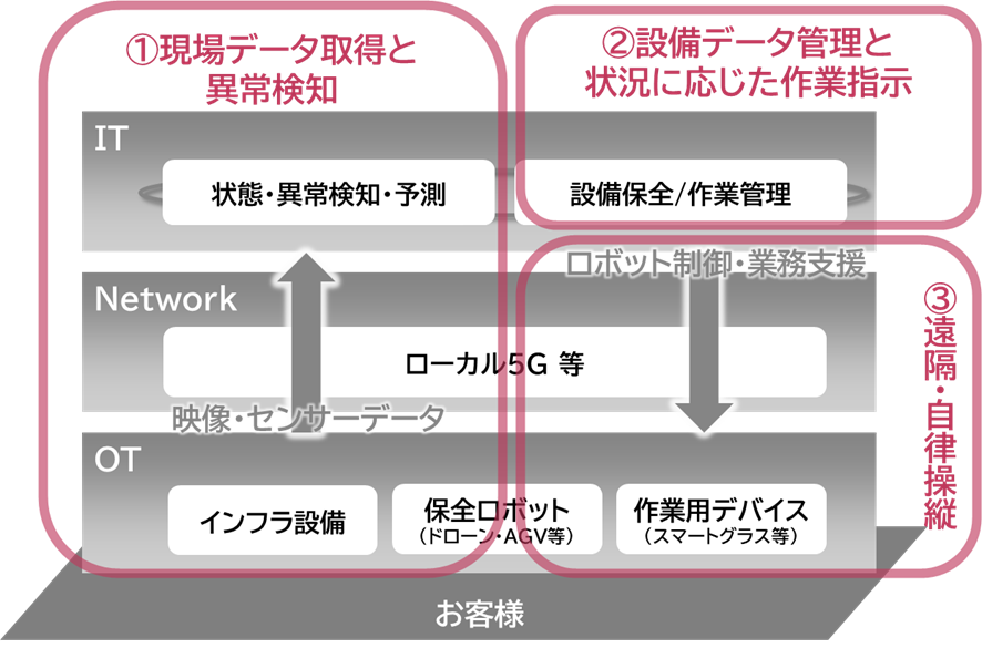 この課題に対応するため、NECと日本IBMは、本年1月よりインフラ保全ソリューションの開発に向けて協業を開始しました。この度、IT、OT、ネットワークを組み合わせ、保全業務の効率化・自動化におけるデモを構築しました。