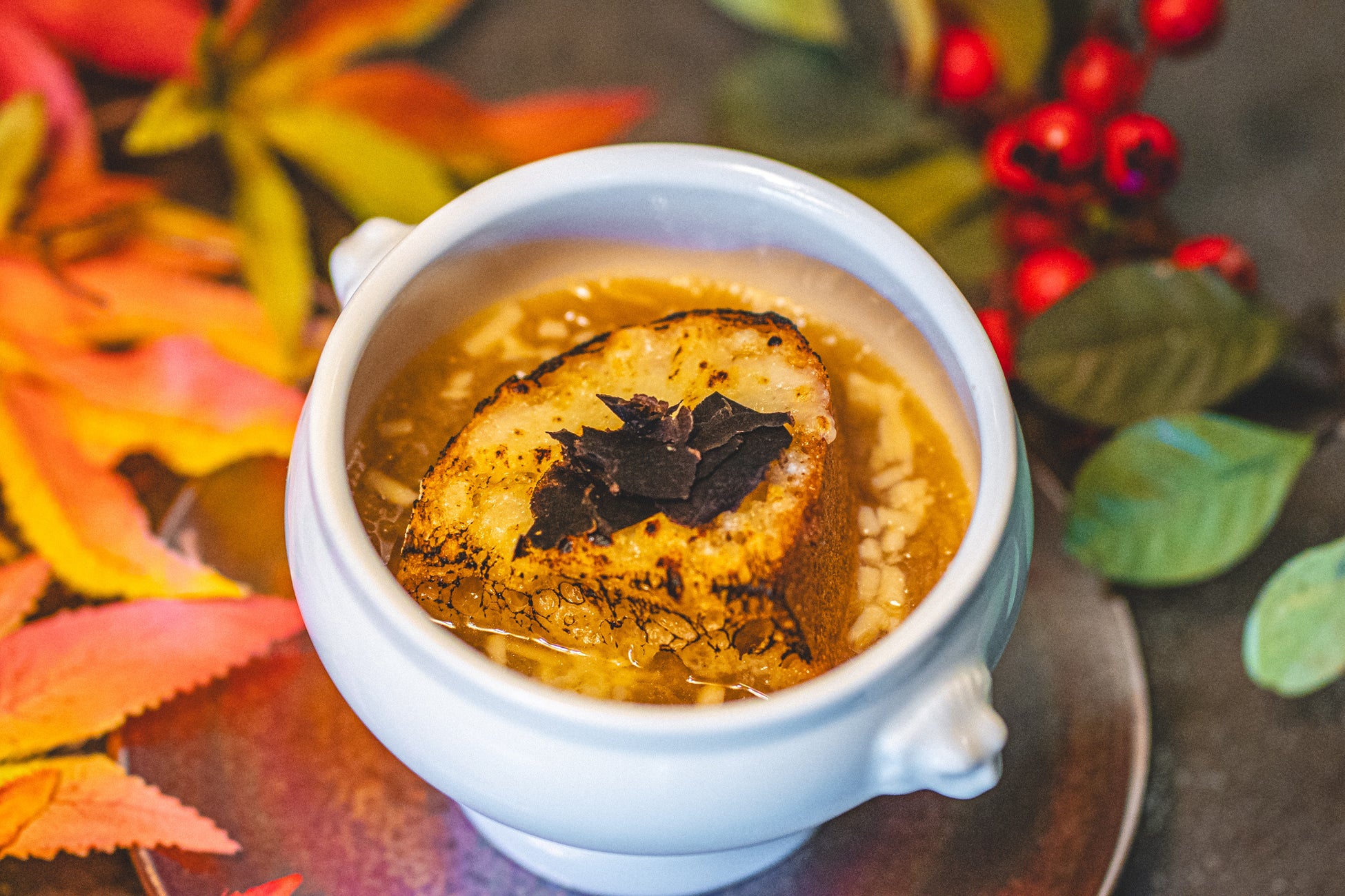 温前菜には、香ばしさとコクを感じる「オニオングラタンスープ」をお楽しみいただけます。芳醇なトリュフと、甘くコクを出した玉葱にグリュイエールチーズを合わせた心温まるスープです。