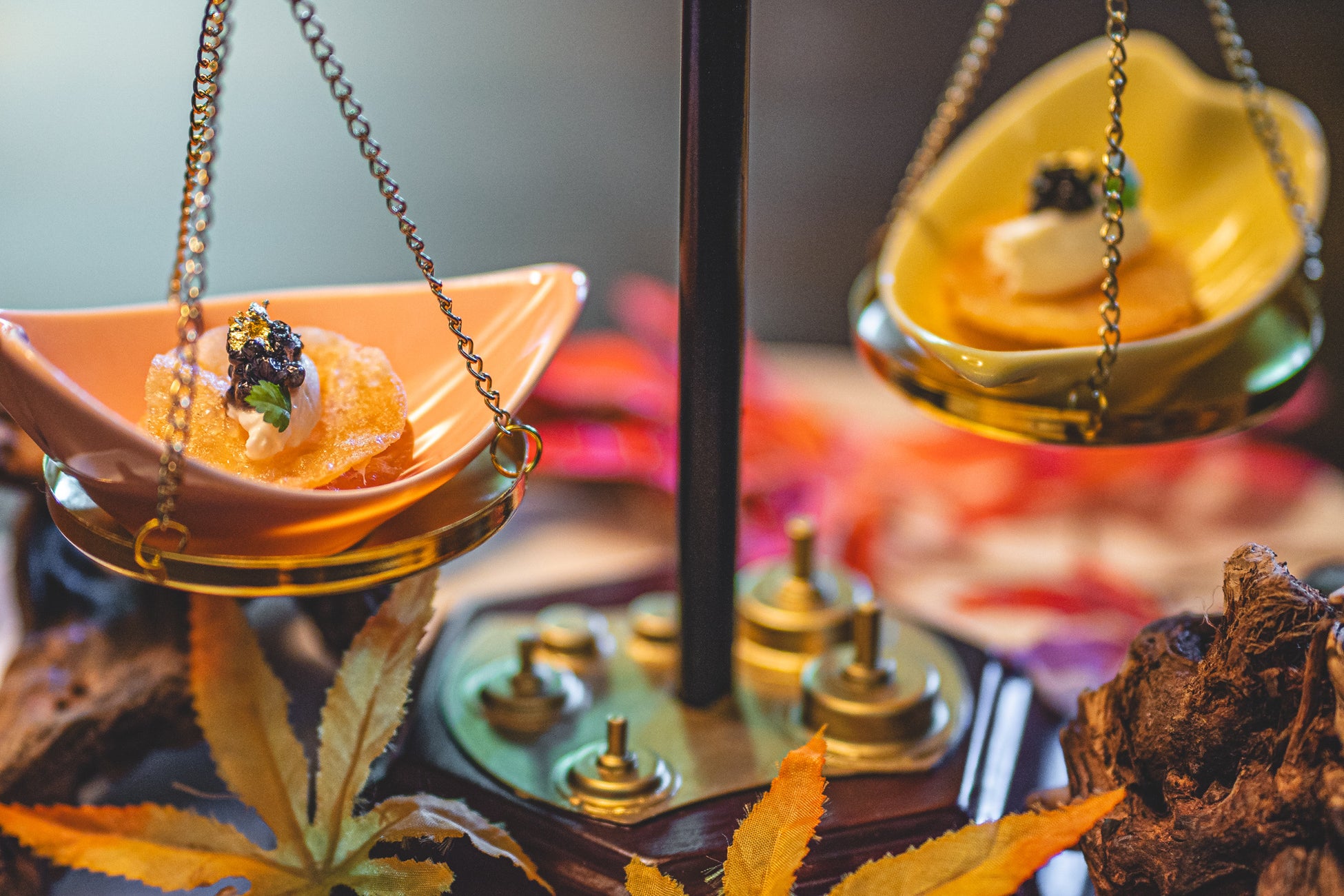 コースの幕開けは、キャビアを添えた華やかな「ミニタコス」のアミューズから。キャビアと爽やかな酸味の自家製サワークリームを、一口のタコスに仕立てました。天秤で二人の相性が計れる!?ユニークなビジュアルで、気分を盛り上げてくれる一品です。