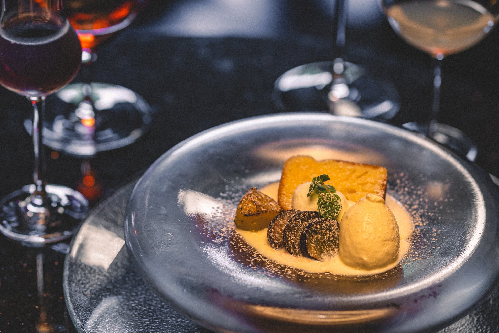 食後には、芳醇なラム酒が香るクラシカルな「ババオラム」をデザートに。バーにあるお好きなラムをお選びいただける、遊び心ある一皿です。