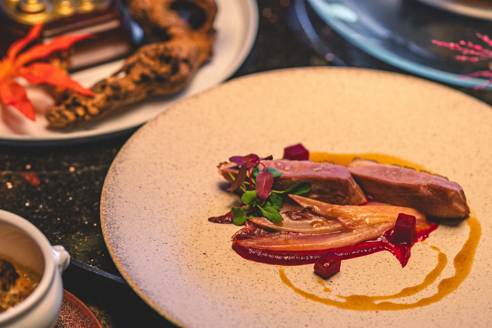 ひとつは、香ばしく焼き上げた「鴨のロースト 柚子香るソース」。繊細で身質の柔らかい鴨肉を柚子の香るソースと合わせた一品です。大地の甘みを感じるビーツと合わせる事で、甘み、酸味、旨みの一体感を楽しんでいただけます。