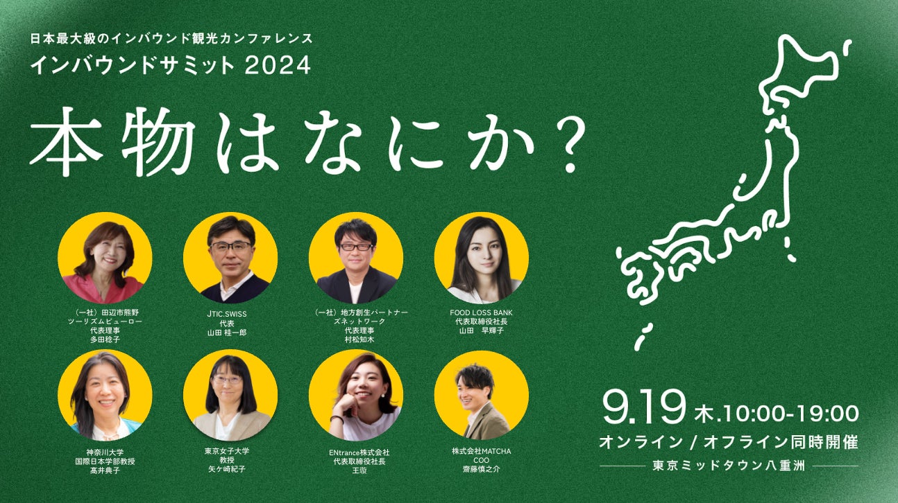 インバウンドサミット2024実行委員会(株式会社MATCHA(本社:東京都中央区、代表:青木優))は、9月19日(木)に開催するインバウンドの未来を考えるビジネスカンファレンス「インバウンドサミット2024」において、新たに一般社団法人 田辺市熊野ツーリズムビューロー 代表理事 多田稔子氏、JTIC.SWISS 代表 山田桂一郎氏、一般社団法人 地方創生パートナーネットワーク 村松知木氏ほかの追加登壇が決定したことをお知らせいたします。