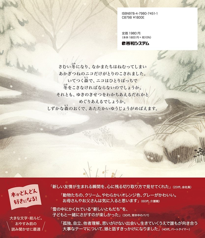 物語の舞台は、深い森。あかぎつねのニコは友達(アライグマやアナグマ)と、楽しくすごしていました。しかし冬のある朝、、友達は皆うずくまり、呼んでもゆすっても起きません…眠ってしまったのです。ニコは、一面の銀世界の中、たったひとりになってしまいました。しかし「なんとかなるさ」と、ひとりでできる遊びを見つけます。夢中で遊ぶニコの耳に聞こえてきた声とは?――しずかな森の奥で、思いがけない友情がめばえます。