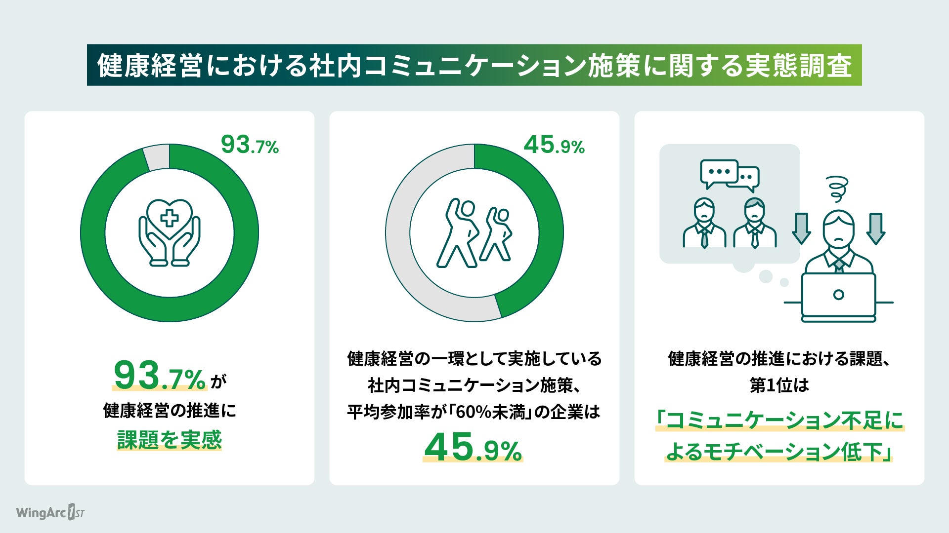 ウイングアーク1st株式会社(本社:東京都港区、代表取締役 社長執行役員CEO:田中 潤、以下、ウイングアーク1st)は、リモートワークを導入し、健康経営に取り組んでいる企業(年商100億円以上)で、健康経営の推進に携わる方111名を対象に、健康経営における社内コミュニケーション施策に関する実態調査を実施しました。