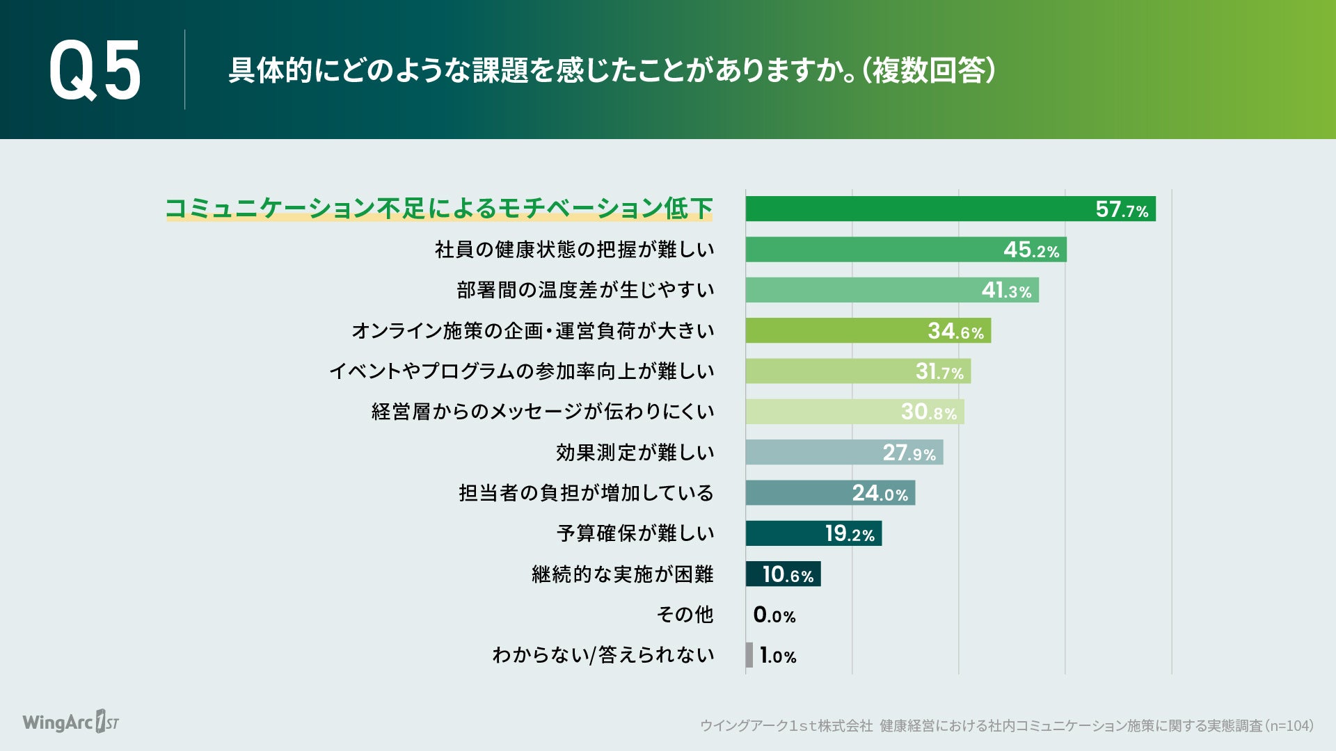 Q4で「非常に感じている」「やや感じている」と回答した方に、「Q5.具体的にどのような課題を感じたことがありますか。(複数回答)」(n=104)と質問したところ、「コミュニケーション不足によるモチベーション低下」が57.7%、「社員の健康状態の把握が難しい」が45.2%、「部署間の温度差が生じやすい」が41.3%という回答となりました。