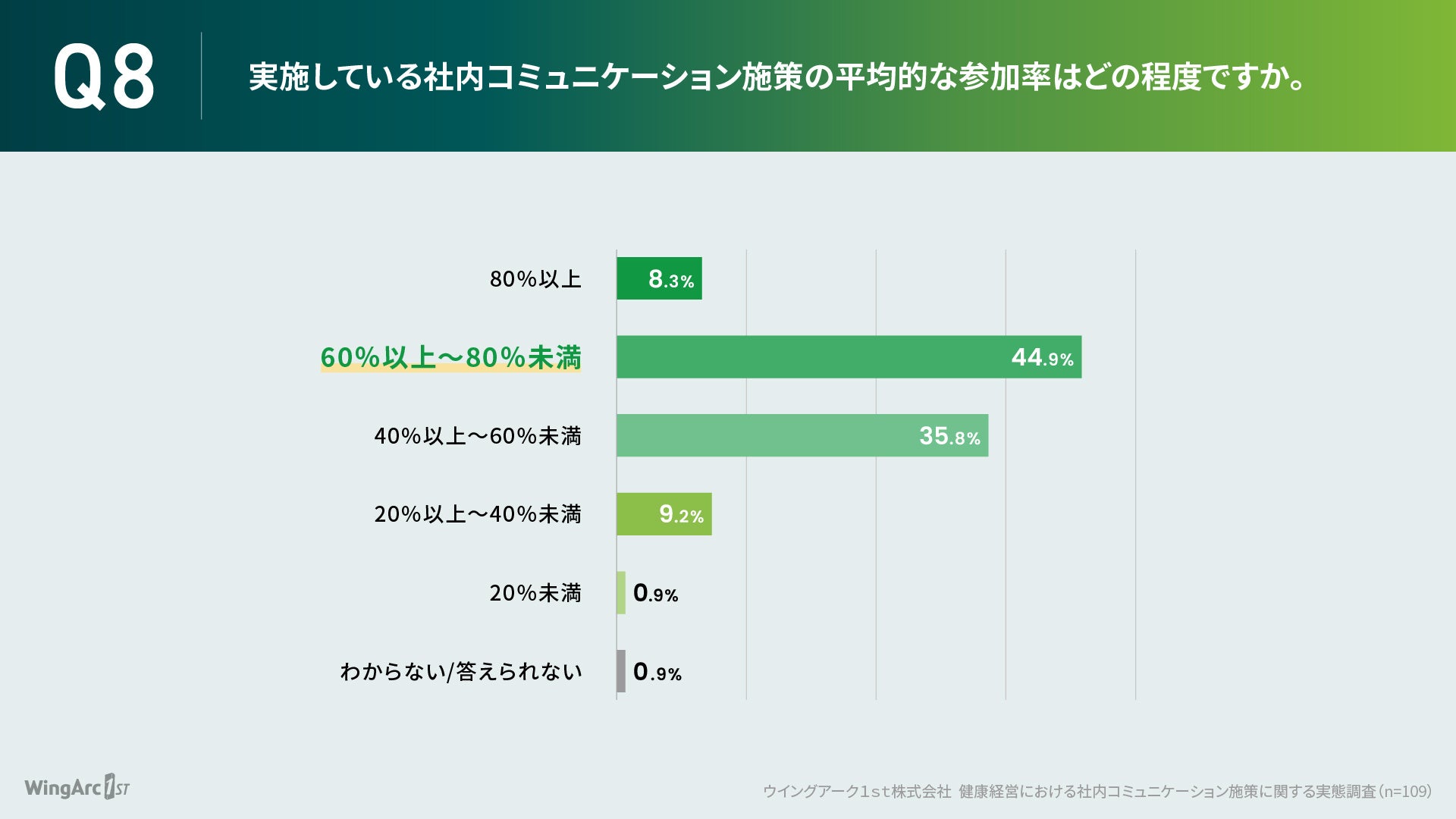 8.社内コミュニケーション施策の平均的な参加率、「60%未満」の企業は、45.9%にのぼる
