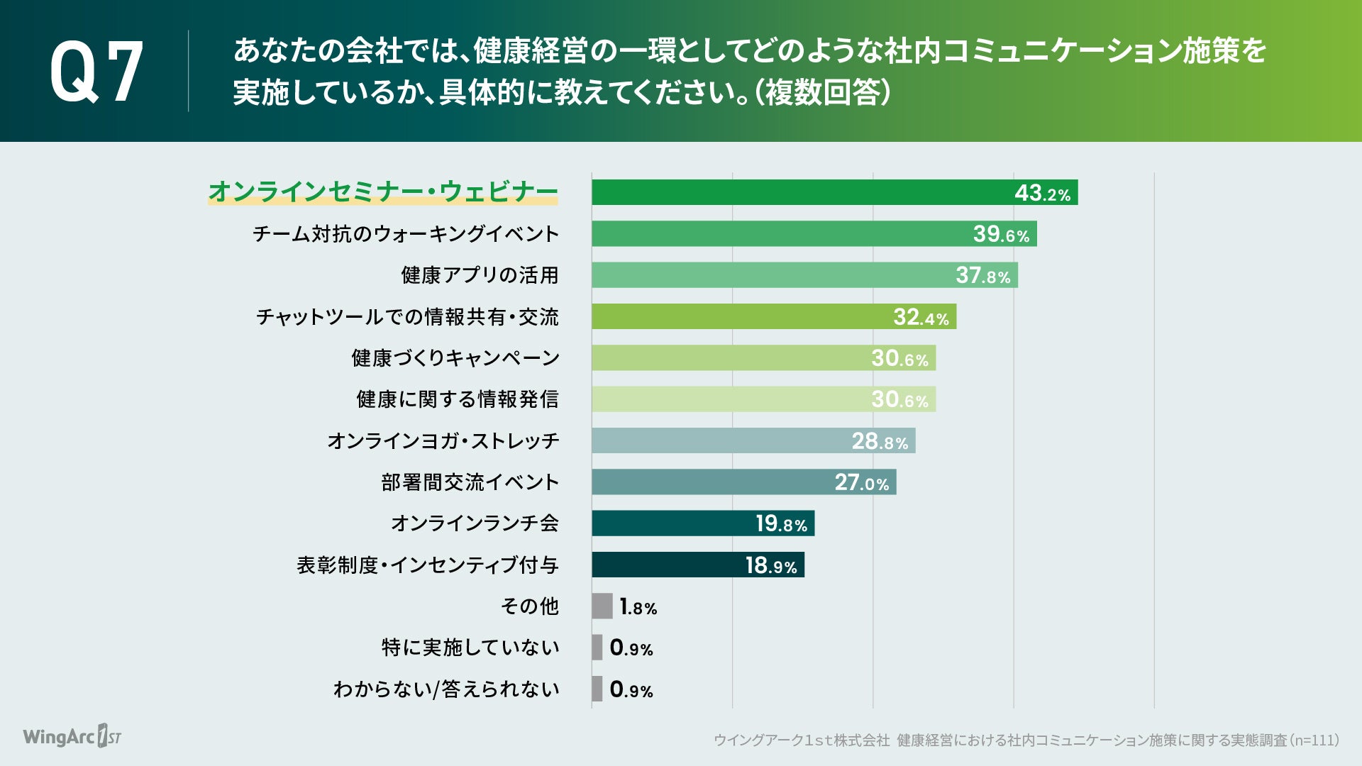 7.健康経営の一環として実施している社内コミュニケーション施策、「オンラインセミナー・ウェビナー」が43.2%で最多