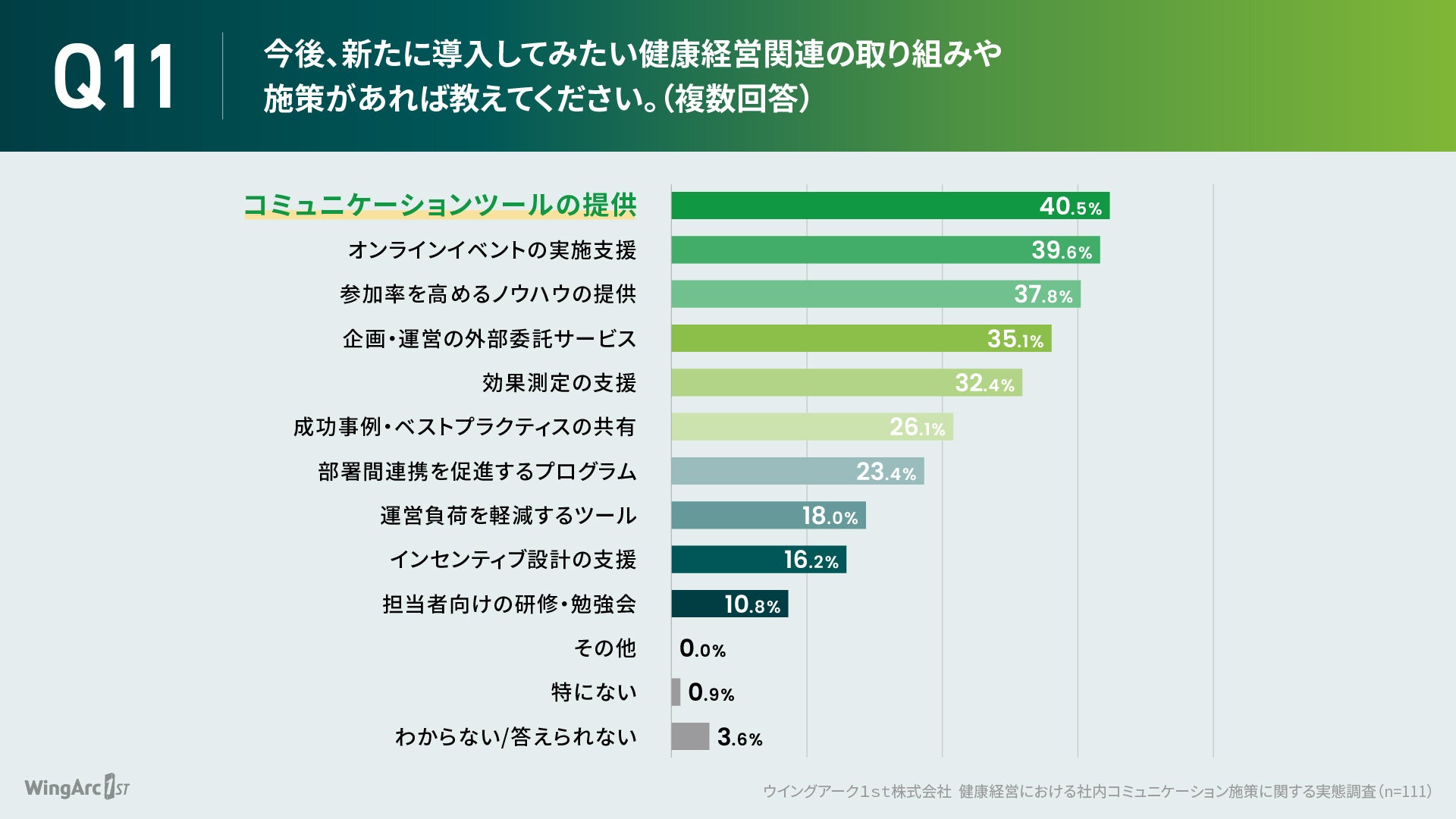 「Q11.今後、新たに導入してみたい健康経営関連の取り組みや施策があれば教えてください。(複数回答)」(n=111)と質問したところ、「コミュニケーションツールの提供」が40.5%、「オンラインイベントの実施支援」が39.6%、「参加率を高めるノウハウの提供」が37.8%という回答となりました。