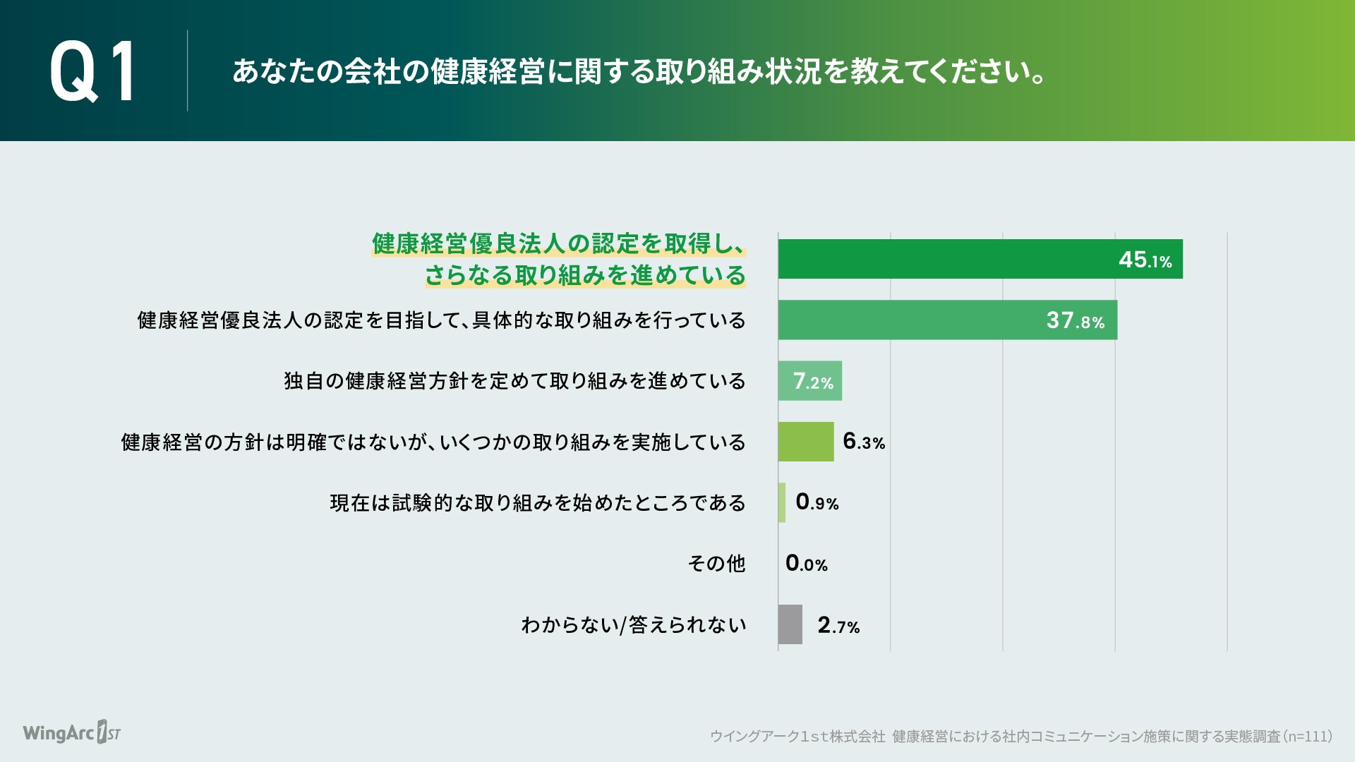 「Q1.あなたの会社の健康経営に関する取り組み状況を教えてください。」(n=111)と質問したところ、「健康経営優良法人の認定を取得し、さらなる取り組みを進めている」が45.1%、「健康経営優良法人の認定を目指して、具体的な取り組みを行っている」が37.8%という回答となりました。