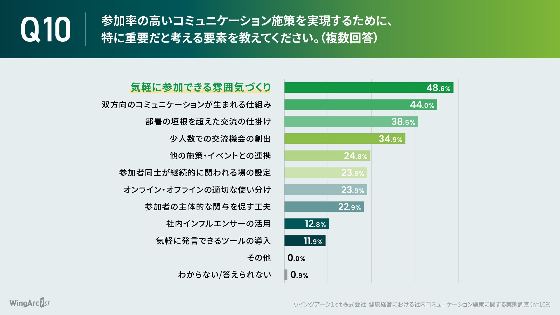 Q7で「特に実施していない」「わからない/答えられない」以外を回答した方に、「Q10.参加率の高いコミュニケーション施策を実現するために、特に重要だと考える要素を教えてください。(複数回答)」(n=109)と質問したところ、「気軽に参加できる雰囲気づくり」が48.6%、「双方向のコミュニケーションが生まれる仕組み」が44.0%、「部署の垣根を超えた交流の仕掛け」が38.5%という回答となりました。