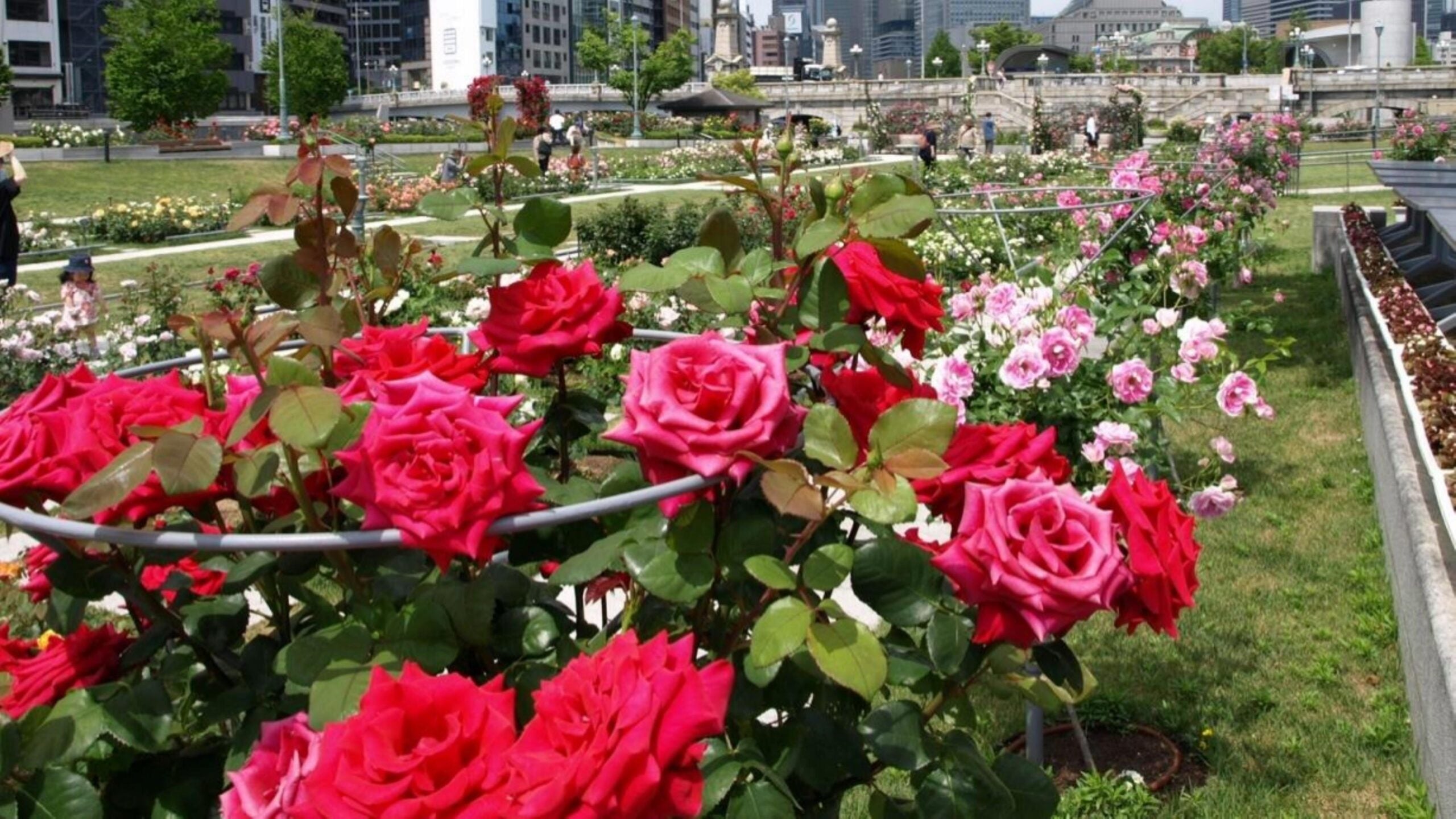 - ①見頃を迎える中之島バラ園でお散歩。