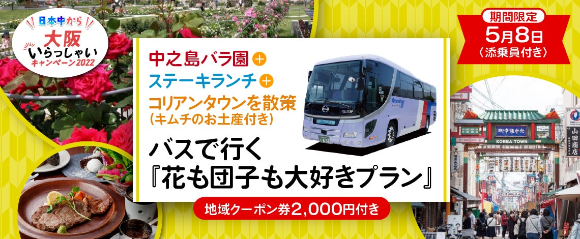【5月8日(月)限定大阪出発】《全国旅行支援》〈添乗員付き〉中之島バラ園+湊町リバーサイドでステーキランチ+鶴橋コリアンタウンを散策(キムチのお土産付き) バスで行く『花も団子も大好きプラン』