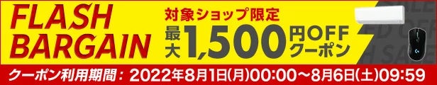 FLASH BARGAIN( https://bit.ly/3PIOl6n )の最大1,500円OFFクーポン利用期間は8/1(月) 00:00 ~8/6(土) 9:59まで