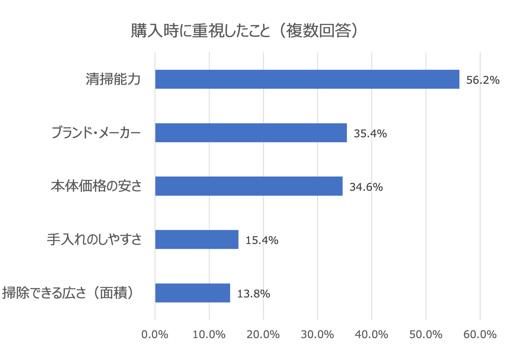 ロボット掃除機購入時に重視したことは「清掃能力」「ブランド、メーカー」「本体価格の安さ」「手入れのしやすさ」「掃除できる広さ」となりました(上記グラフ、複数回答)。