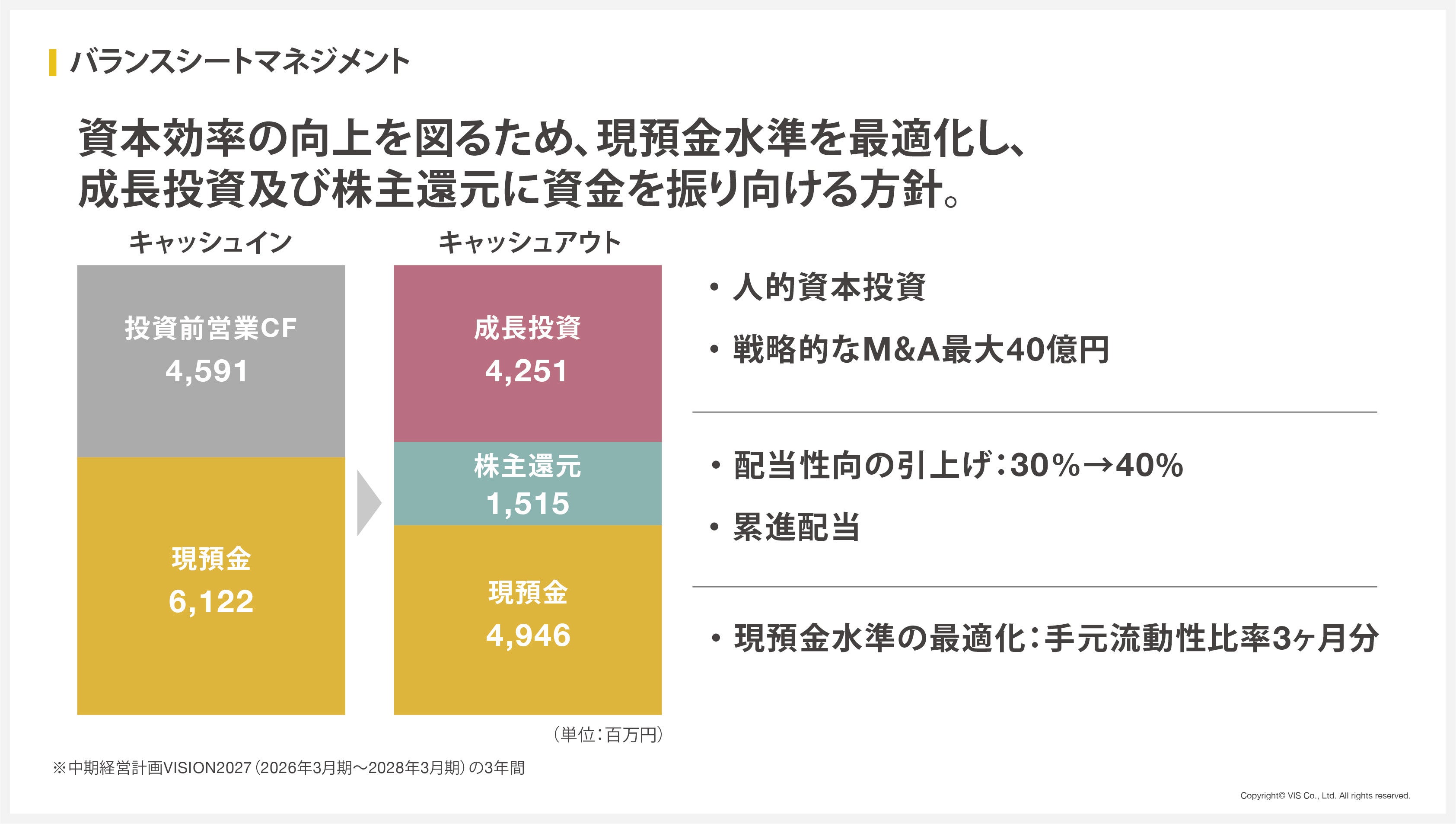 この資金については、資本効率の向上を図るため、現預金水準の最適化(手元流動性比率は3ヶ月分を目安)を行い、成長投資および株主還元に重点的に配分してまいります。