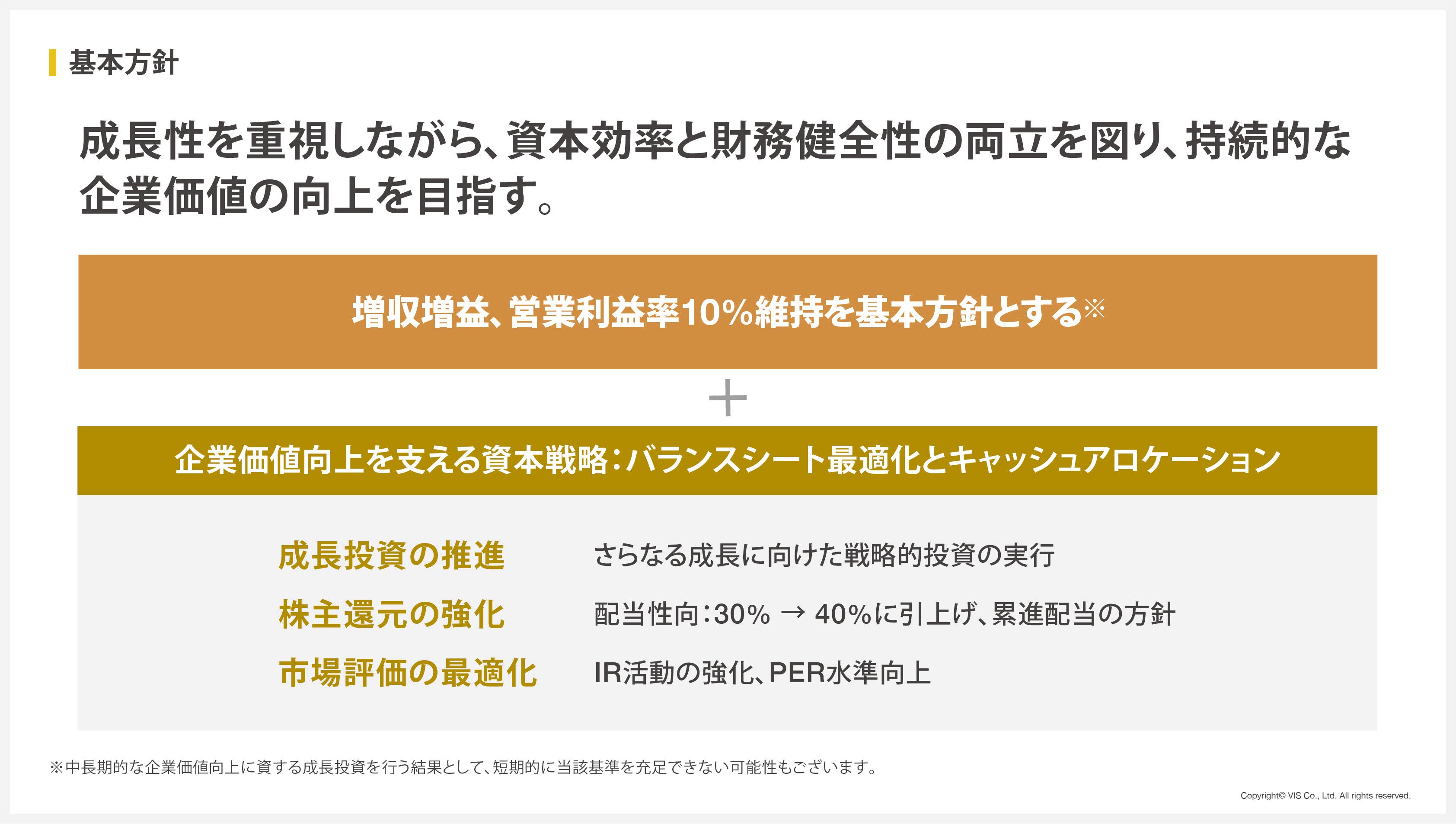 当社は、成長性・資本効率・財務健全性のバランスを重視し、持続的な企業価値の向上を目指しています。成長性に関しては、増収増益と営業利益率10%の維持を基本方針(※)としております。さらに、バランスシートの最適化とキャッシュアロケーションを軸に、以下の取り組みを推進します。