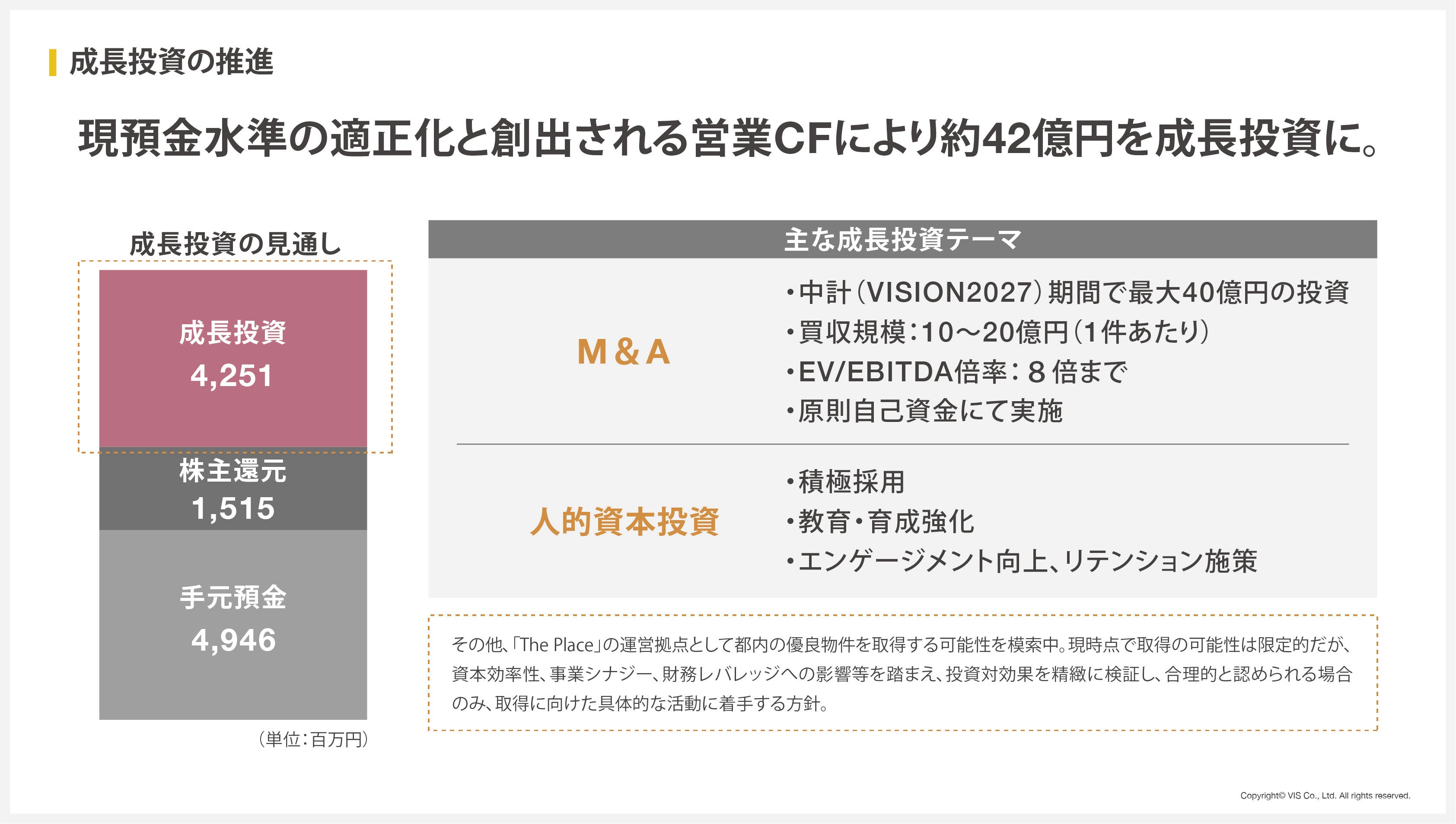 中期経営計画期間において、最大40億円規模の投資を実施する方針であり、現在、具体的な案件を模索しています。買収規模は1件あたり10~20億円を目安とし、EV/EBITDA倍率8倍までを基準として検討します。実現の際には、原則として自己資金で実施する予定です。