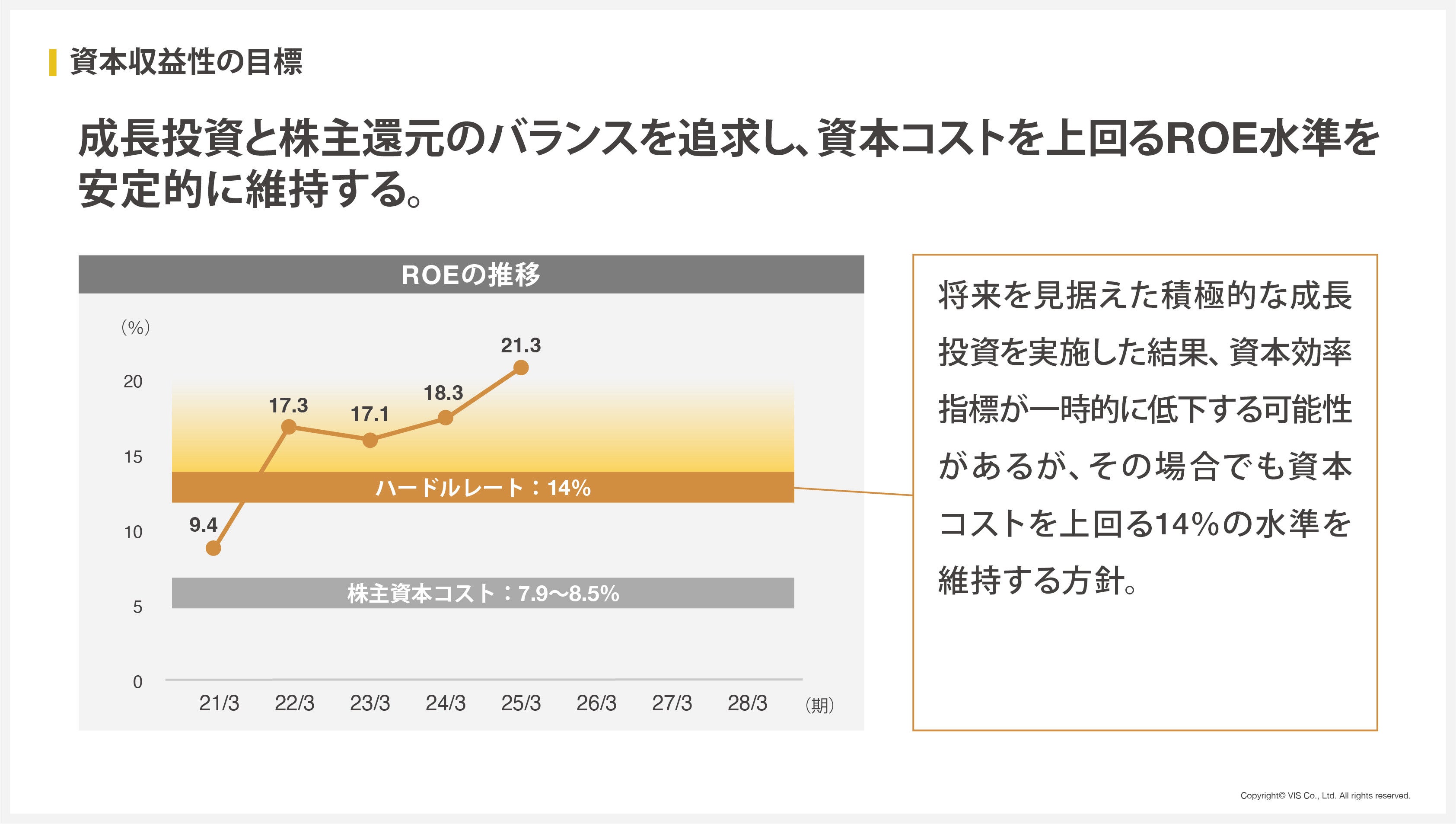 成長投資と株主還元のバランスを追求し、資本コストを上回るROE水準の安定的な維持を目指しています。将来を見据えた積極的な成長投資により、資本効率指標が一時的に低下する可能性はあるものの、ROEのハードルレートを14%に設定し、資本コスト(約8%)を上回る水準を堅持することを基本方針としています。
