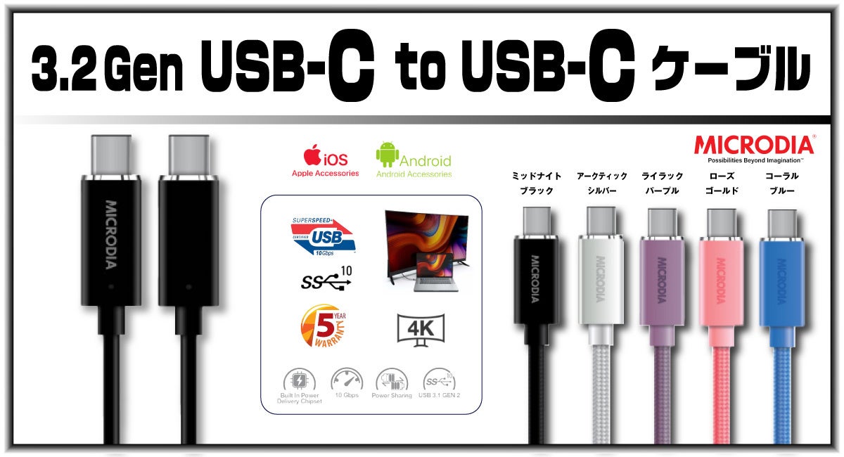 ■【5年保証】のマイクロディア社3.2 Gen 2 USB-C to USB-Cケーブルの特徴