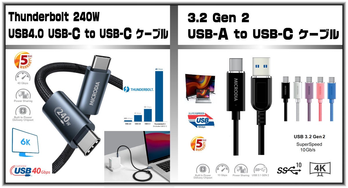 USB-C to USB-C & USB-A to USB-Cケーブル、 Thunderbolt 240W USB4.0 USB-C to USB-Cケーブル