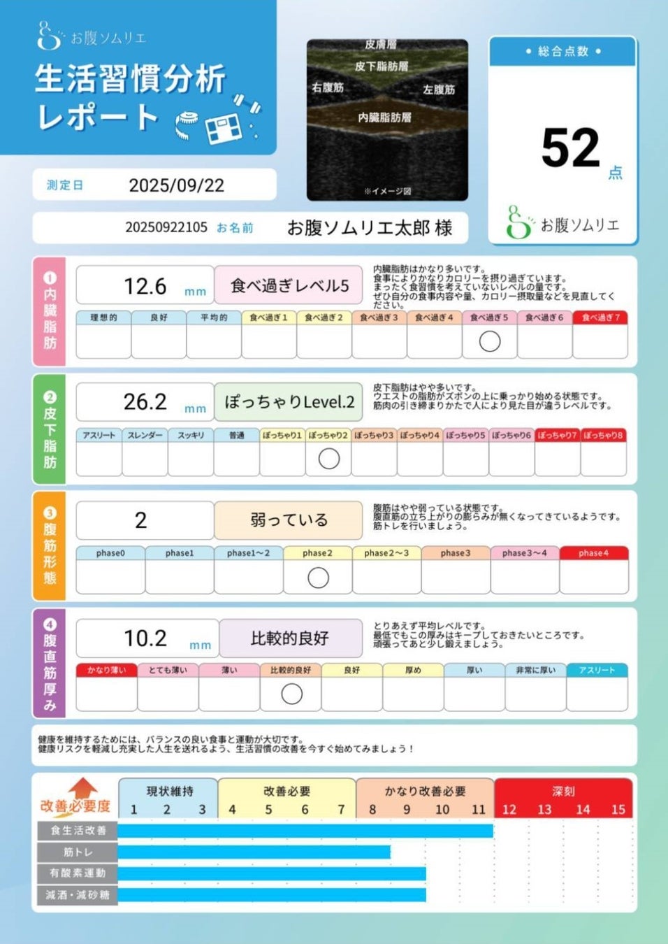 お腹ソムリエは、エコーでお腹の脂肪や筋肉を“見える化”する体験型サービスです。生活習慣をスコア化しあなた専用のアドバイスをご提供。短時間で結果が分かり、これまでの生活習慣の傾向や、これから取り入れると良い健康のヒントをお伝えします。
