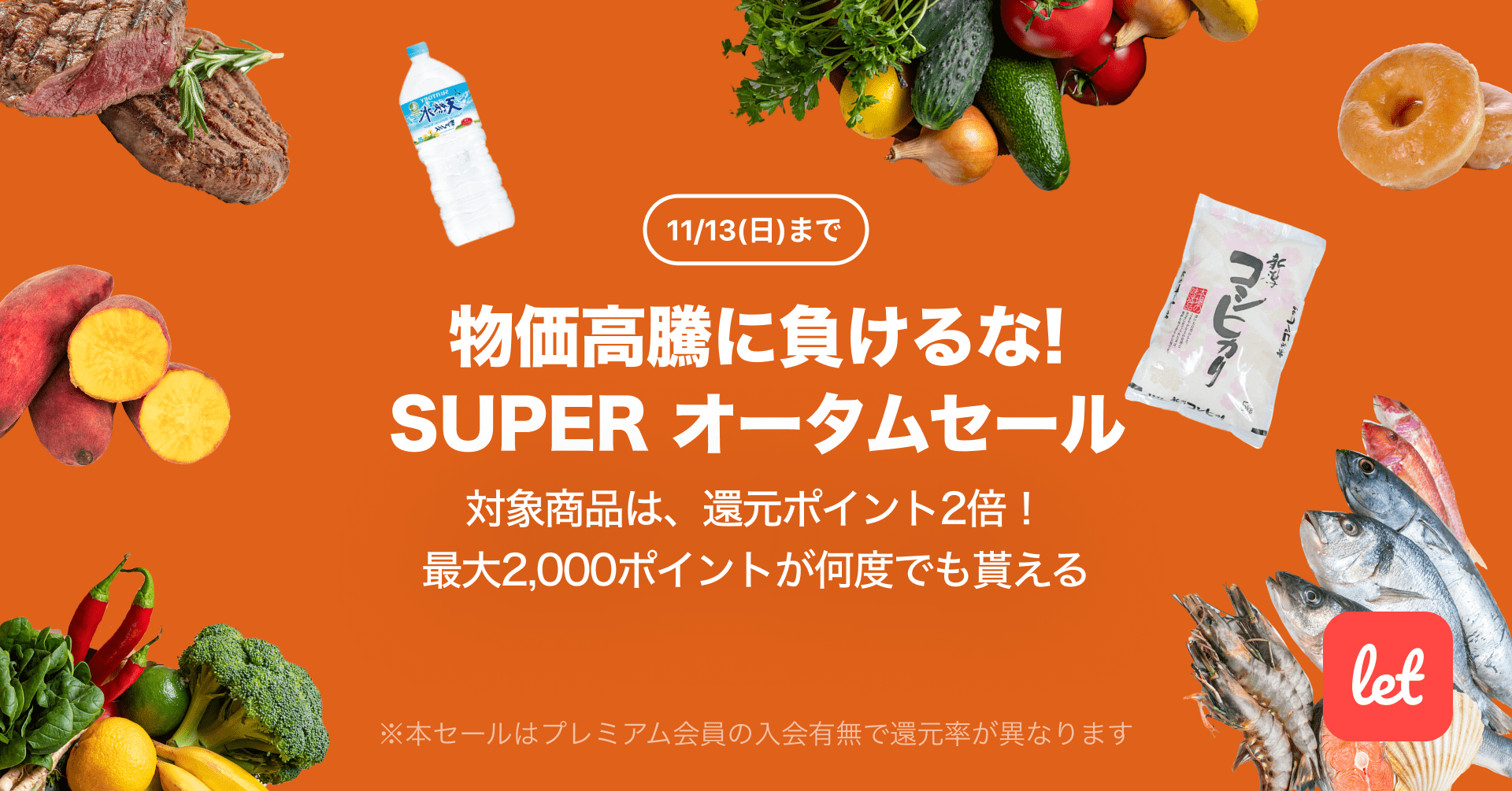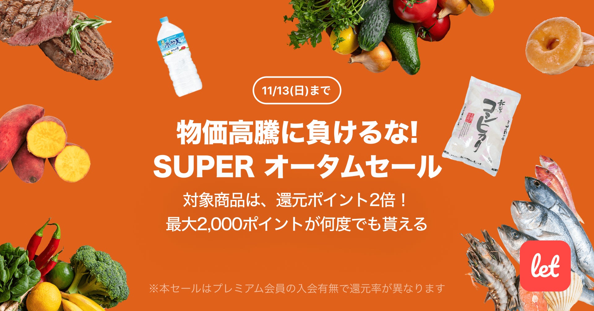 株式会社レット(本社:東京都港区、代表:佐藤 航陽)が運営する、食品ロス/在庫ロス削減のマーケット「Let(レット)」内で「物価高騰に負けるな!SUPER オータムセール」を11月11日(金) 18:00より開催します。期間中、プレミアム会員様限定で対象の食品をご購入いただくと、2,000ポイントを上限に還元ポイントが2倍になります。期間中のご購入であれば、ポイント還元はお一人様あたり何度でもご利用いただけます。