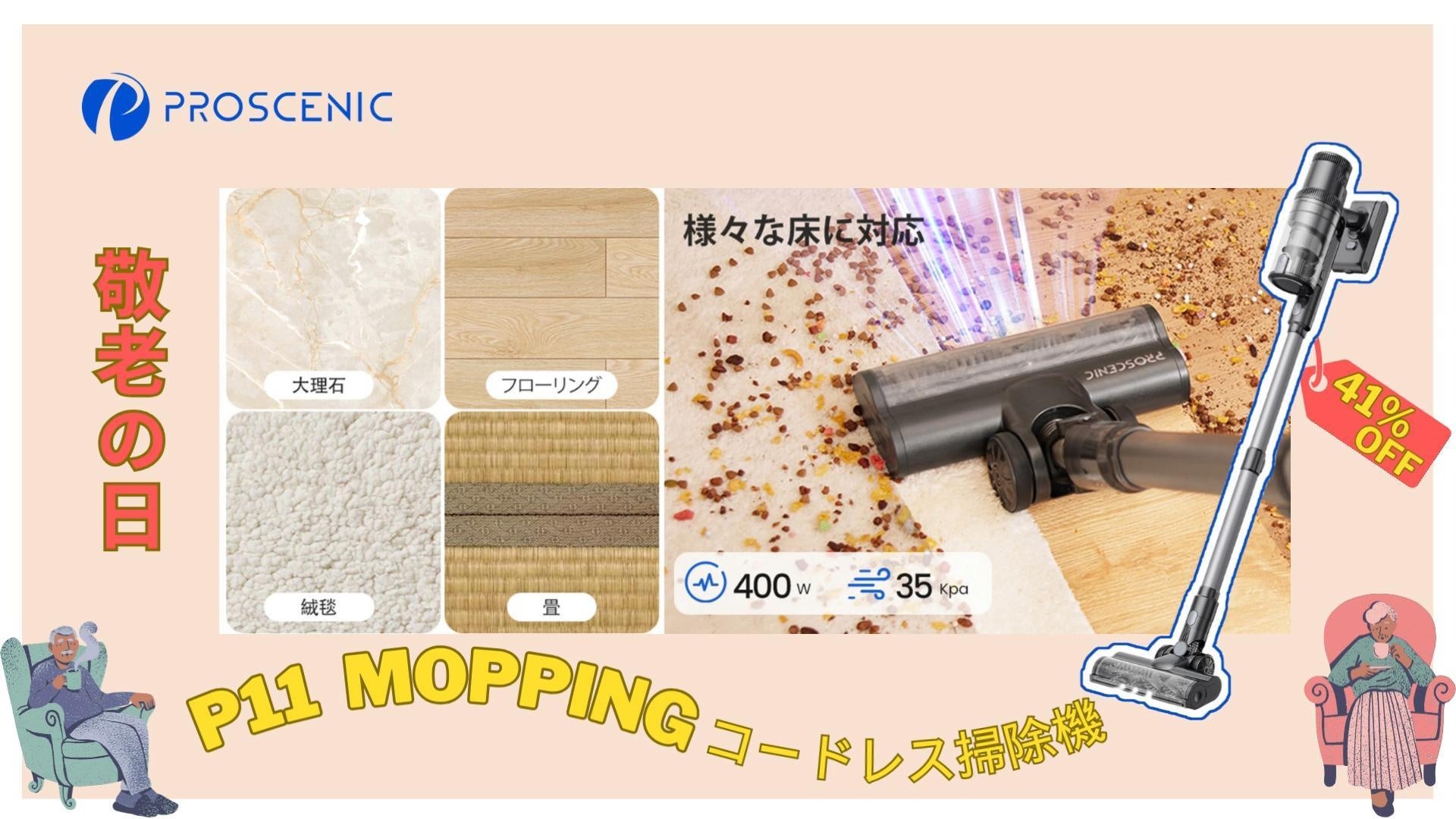 お掃除のプロ、Proscenicが誇るP11 Moppingコードレス掃除機が、敬老の日を祝して特別セールを実施いたします!この限定キャンペーンは、9月17日(日)の00:00から9月19日(火)の23:45まで、Amazonにて開催されます。通常価格27,990円のP11 Moppingを、なんと16,470円で手に入れるチャンスです。これは最大41%OFFの大変お得な価格となっております。
