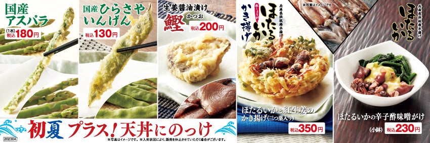 いつものご注文に初夏の味覚をプラス!天つゆや塩で食べても、お好きな天丼に"のっけ"て丼たれで食べても美味しい、バラエティー豊かなラインアップです。