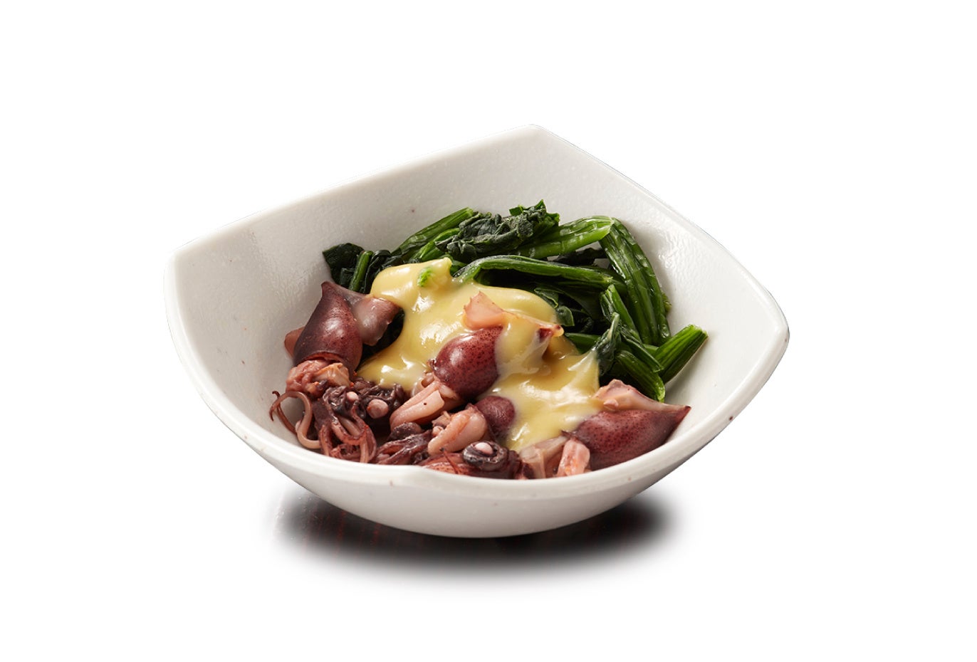 初夏に旬を迎えるぷりぷりした食感の「ほたるいか」とほうれん草のおひたし。