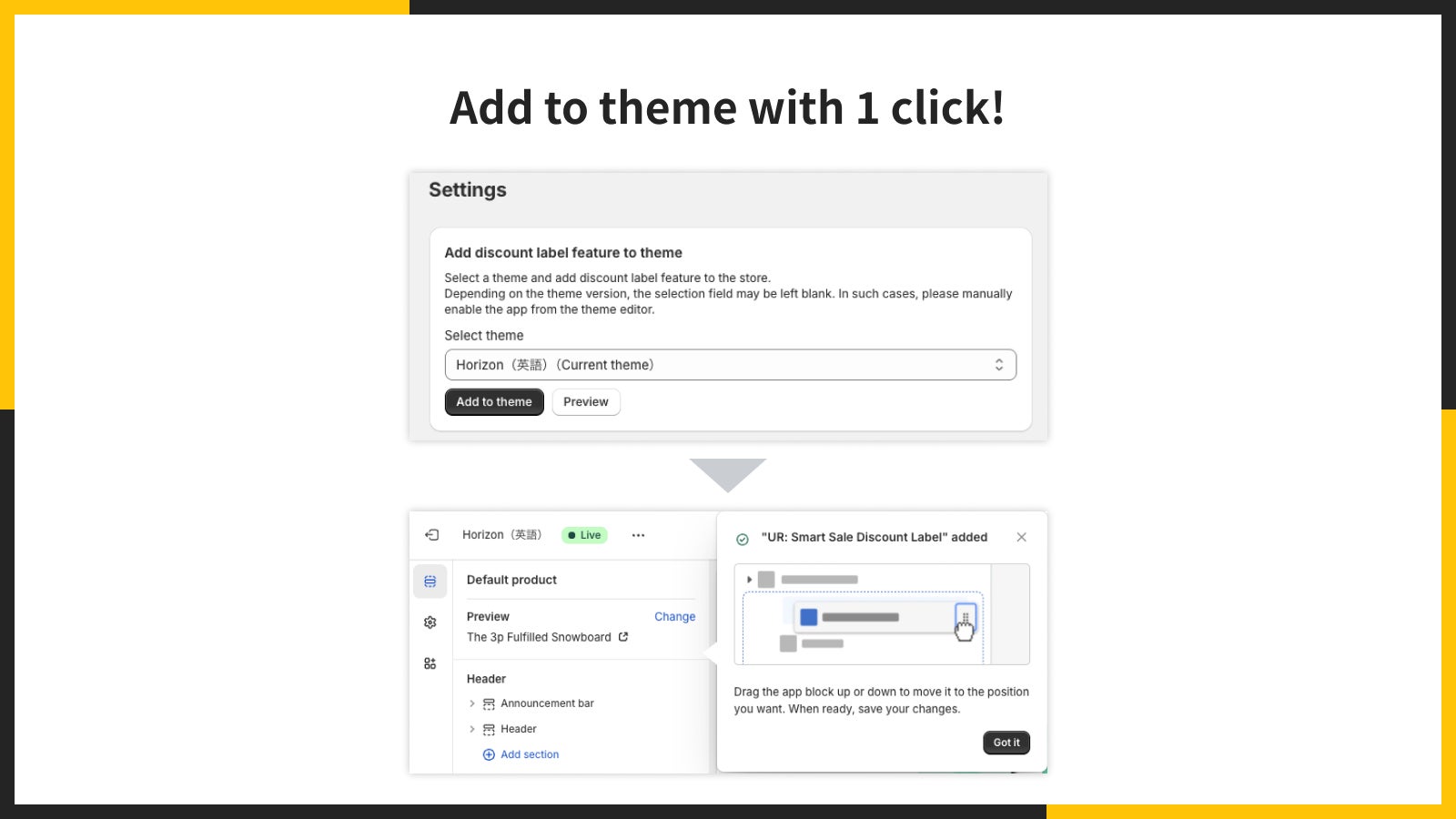 HTML や CSS、Liquid などの専門知識は不要で、既存テーマを大きく改修する必要もありません。