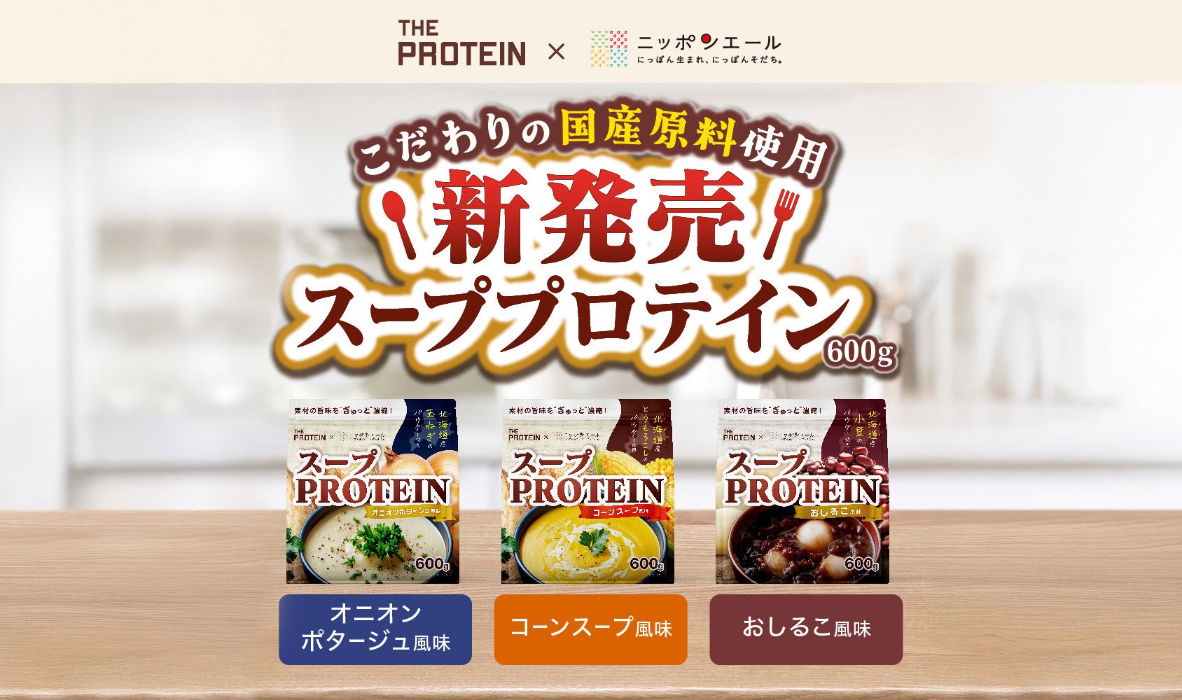 「THE PROTEIN×ニッポンエール 〈おしるこ風味〉〈オニオンポタージュ風味〉〈コーンスープ風味〉」を共同開発いたしました!